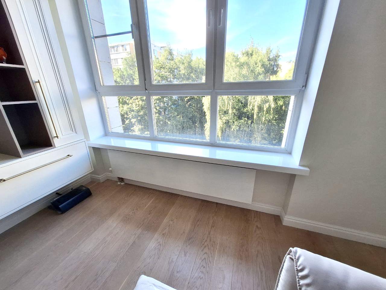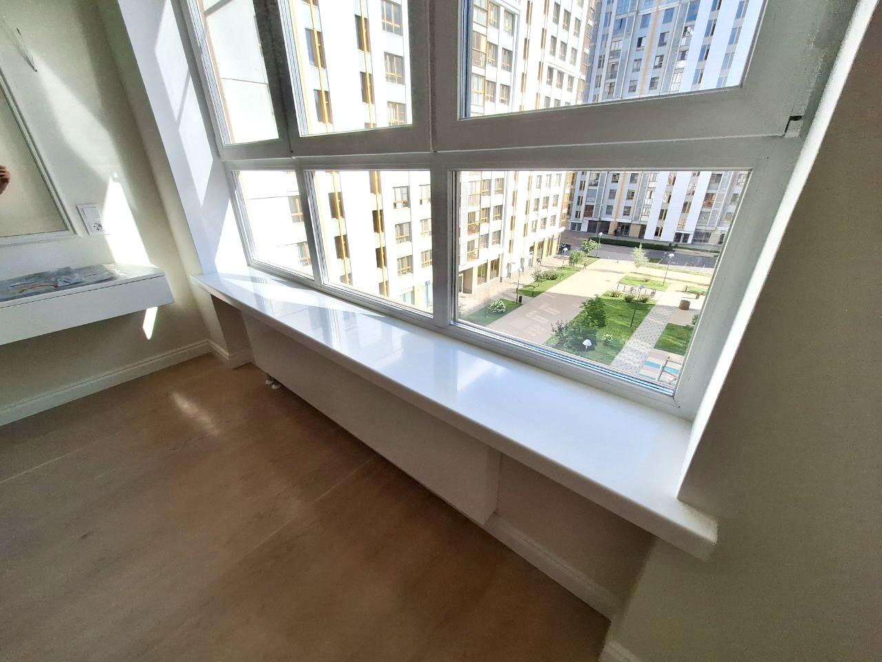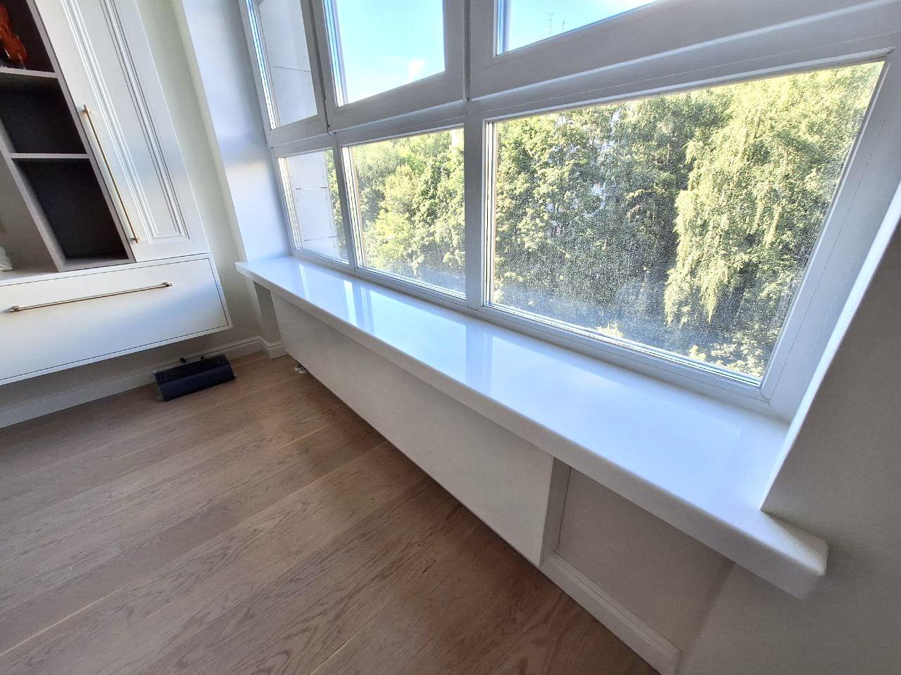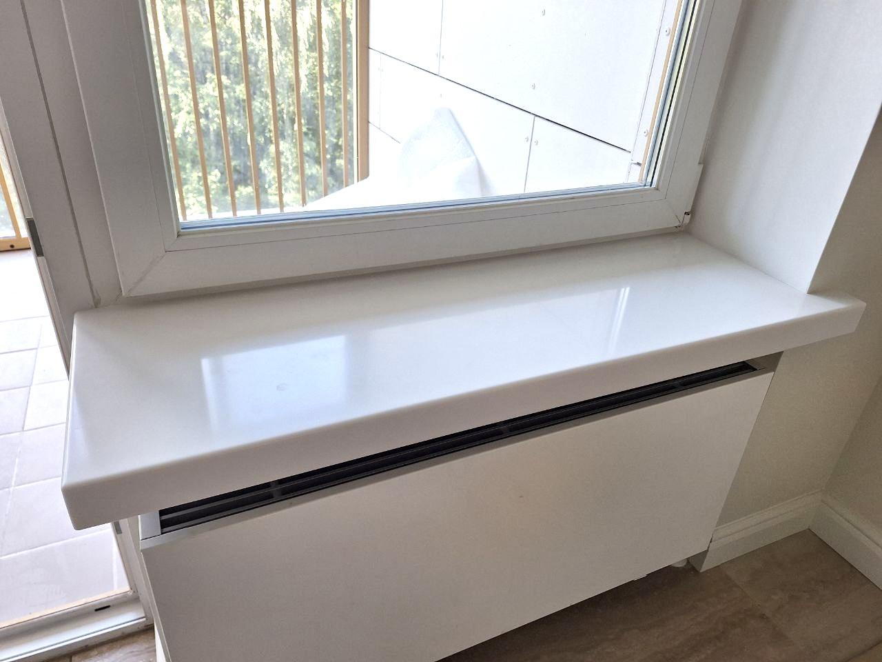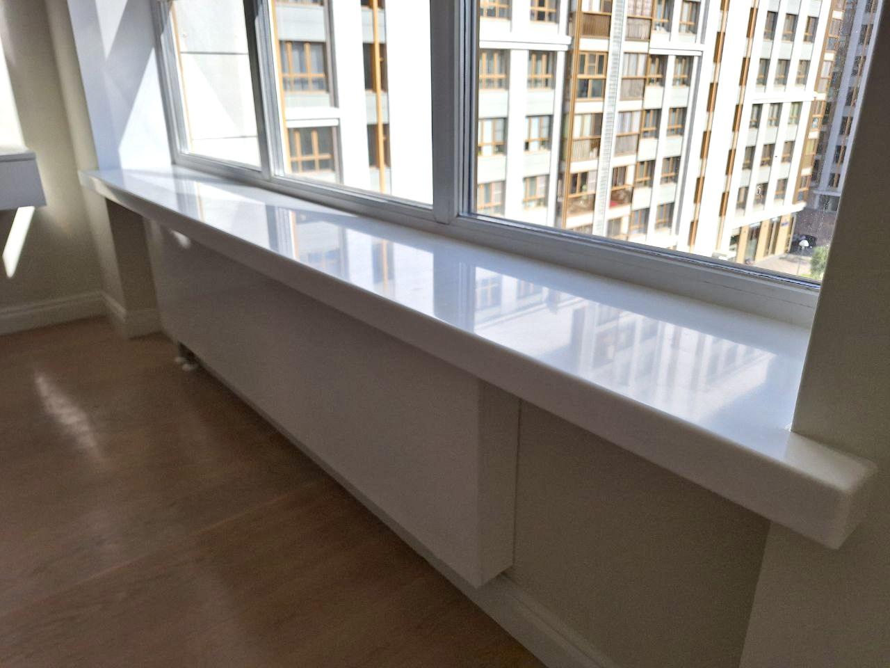 3 подоконника изготовлены из белого акрилового камня - Grandex S-203 Sparkling Sand. Камень – с мелкими светлыми вкраплениями.