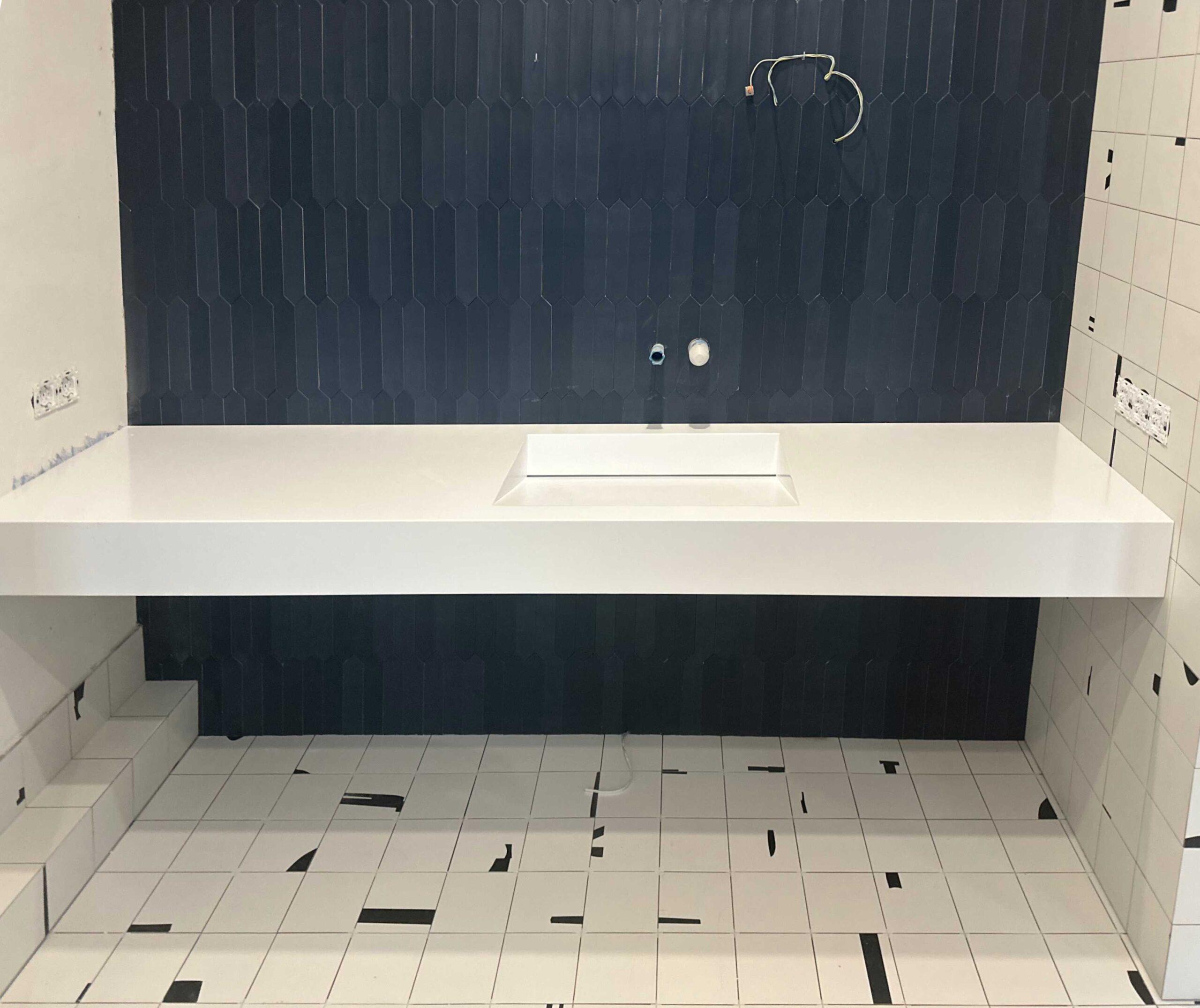 Из белого однотонного акрилового камня Staron Project Quasar White SQ019 изготовили столешницу с щелевой раковиной.