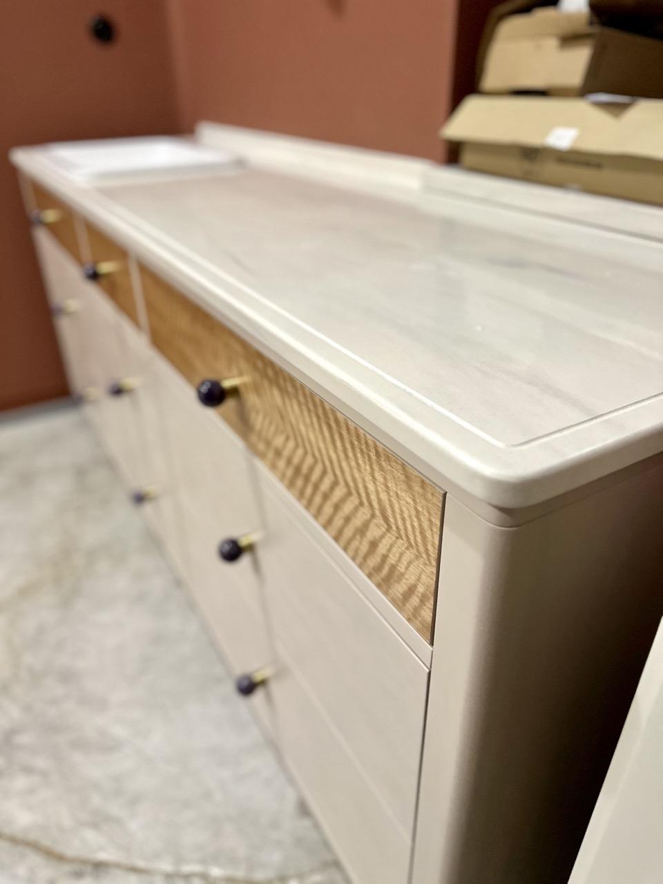 3 столешницы сделаны из белого акрилового камня Grandex M-710 Float Rock (сторона А). Расцветка с мелкими прожилками серого цвета.