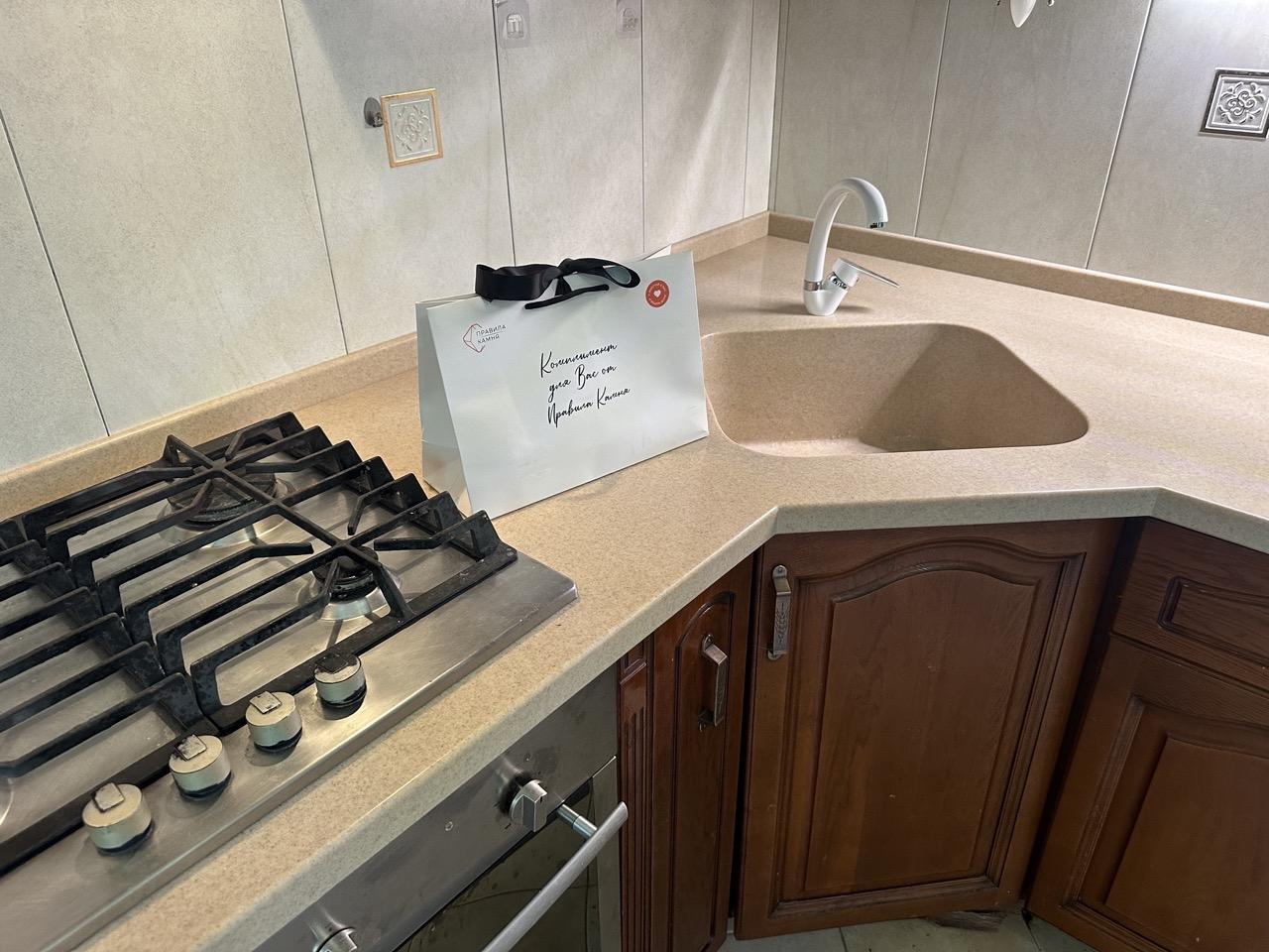 П-образная столешница на кухню сделана из акрилового камня Staron SO446 Sanded Oatmeal. С одной стороны столешница имеет скос. Форма - в точности повторяет предыдущую.