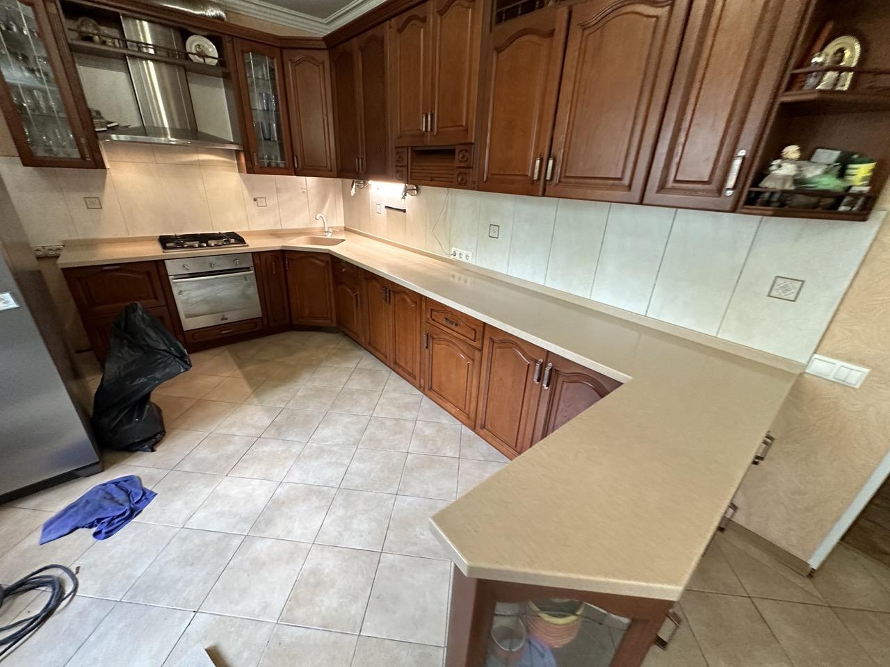 П-образная столешница на кухню сделана из акрилового камня Staron SO446 Sanded Oatmeal. С одной стороны столешница имеет скос. Форма - в точности повторяет предыдущую.