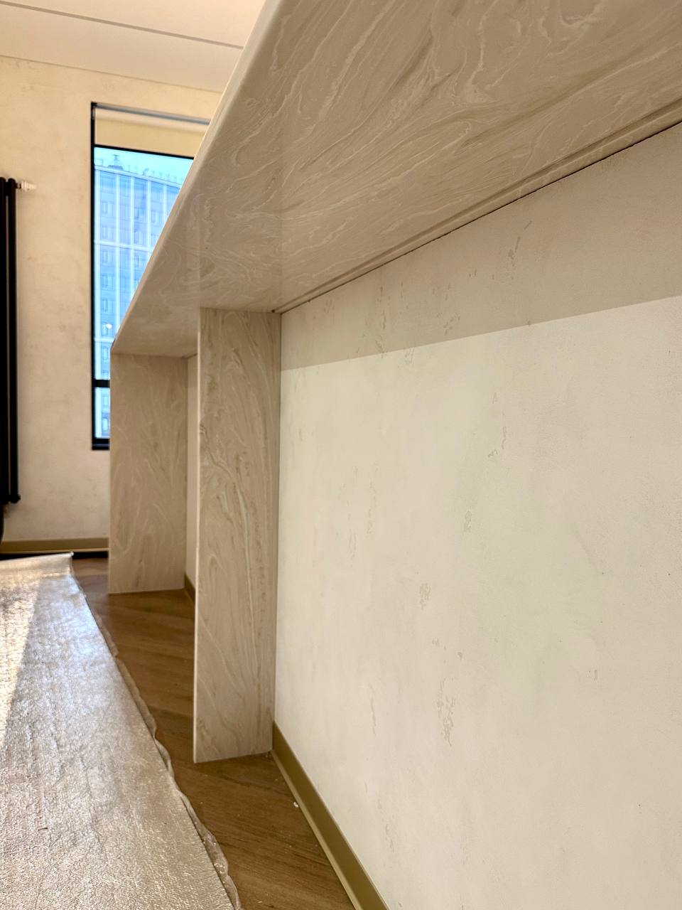 Акриловая угловая столешница изготовлена из однотонного камня бежевого цвета Grandex P-101 Pure Vanilla.