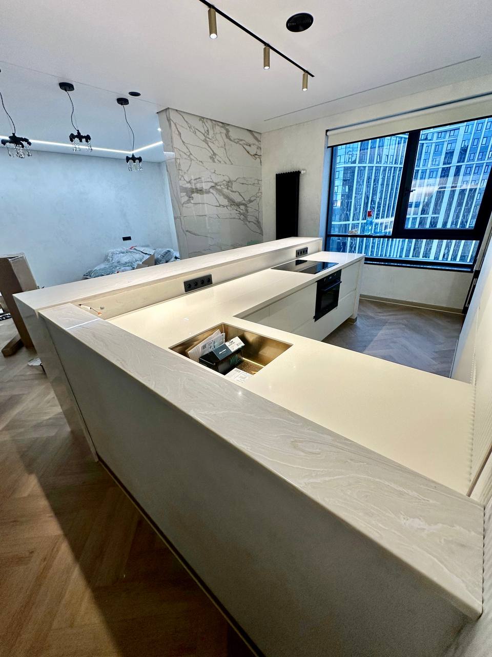 Благодаря барной стойке, пространство визуально делится на зоны. А сочетание двух камней делает помещение визуально больше и помогает правильно расставить акценты и сделать изделия более оригинальными.