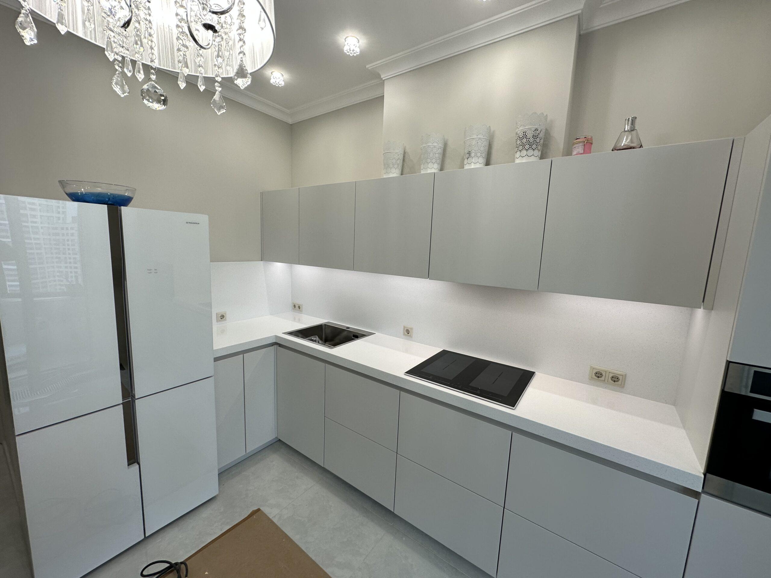 Бесшовная угловая столешница и фартук на кухню из искусственного камня