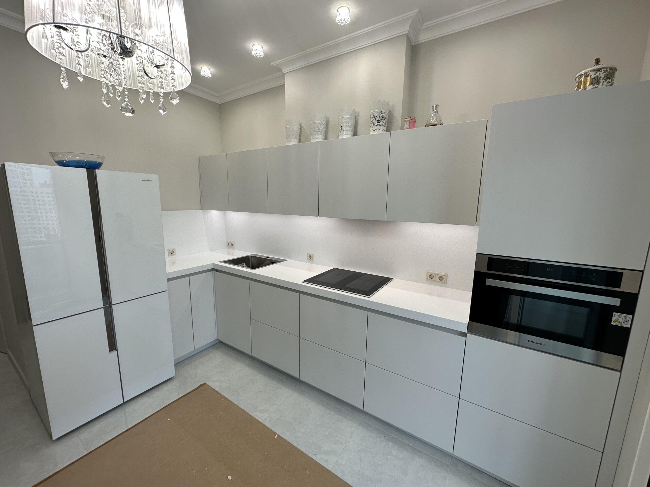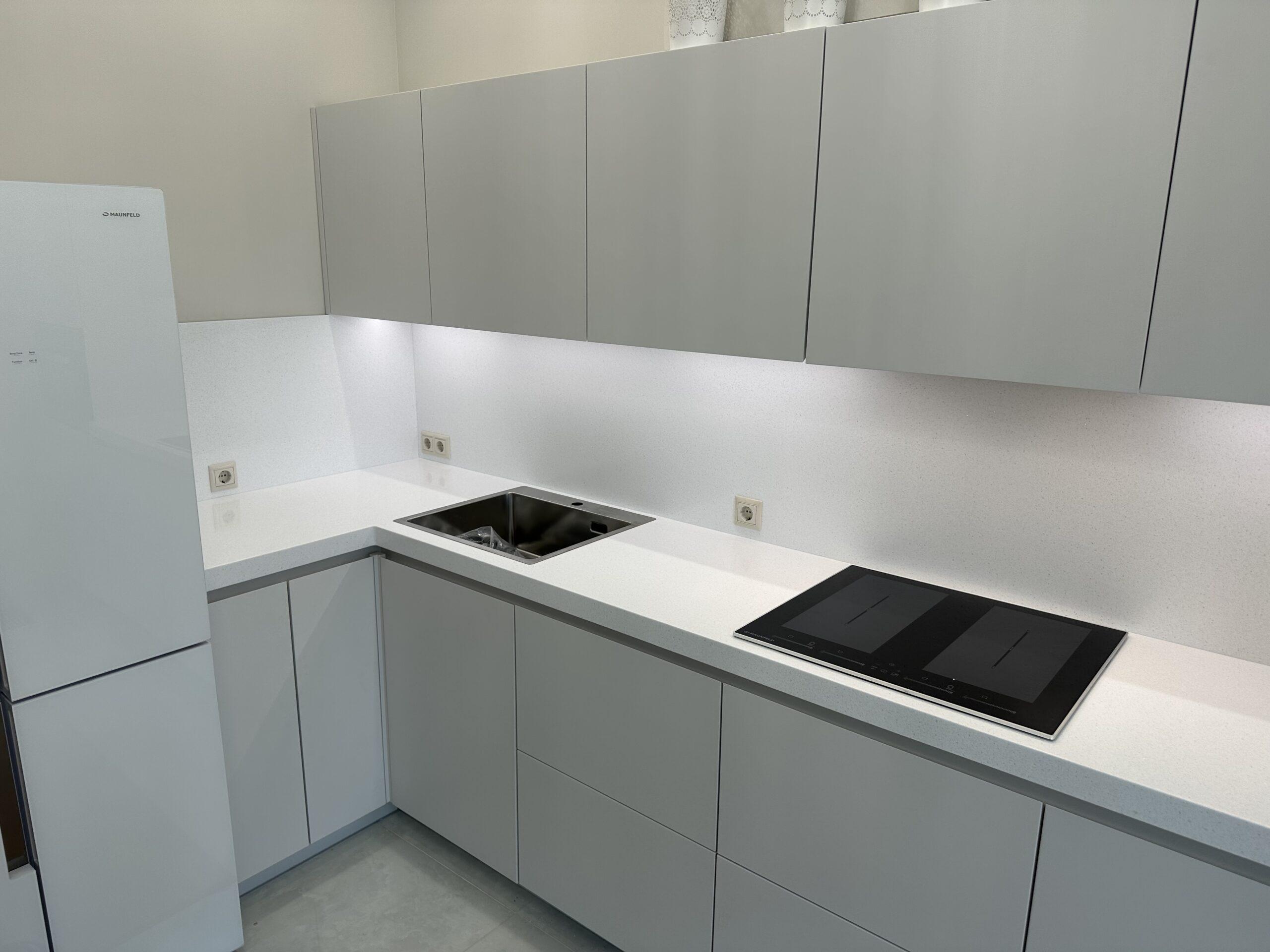Бесшовная угловая столешница и фартук на кухню из искусственного камня