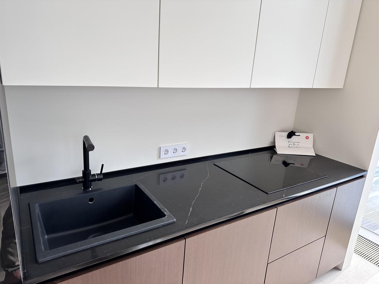 Черная кухонная столешница сделана из черного кварцевого агломерата - Coante 7716 Arte Black. Крупные белые прожилки акцентно выделяются на темном фоне, но при этом смотрятся очень гармонично.