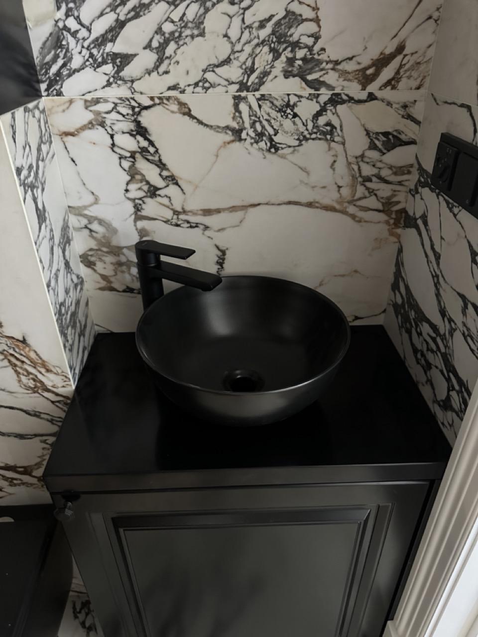 Прямоугольная черная столешница из акрилового камня изготовлена специально под настольную раковину-чашу. Камень – однотонный с глянцевой поверхностью.