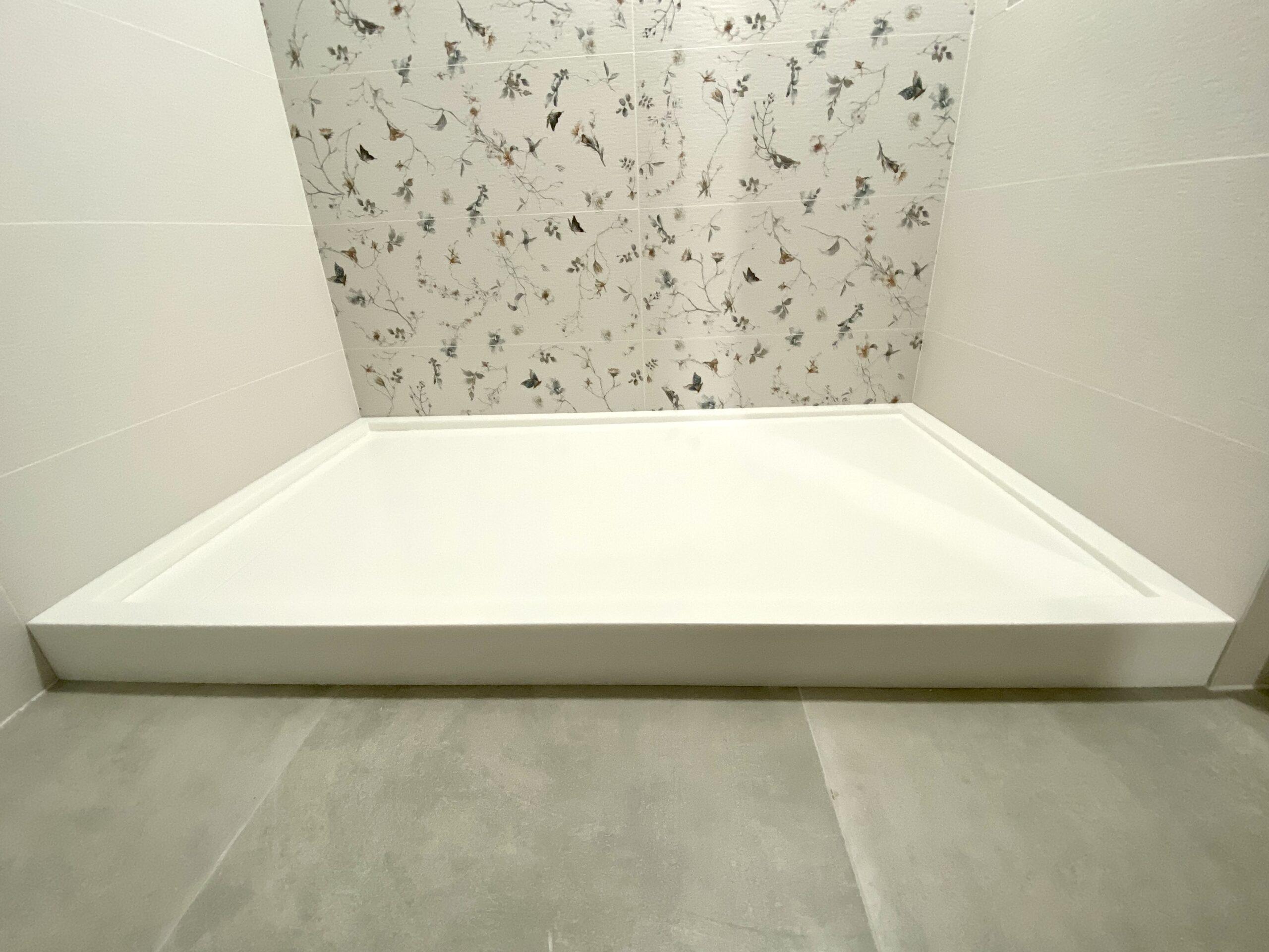 Два душевых поддона из акрилового камня изготовлены по индивидуальному заказу клиента. Изделия отличаются всего несколькими миллиметрами – всё строго по размерам ниш.