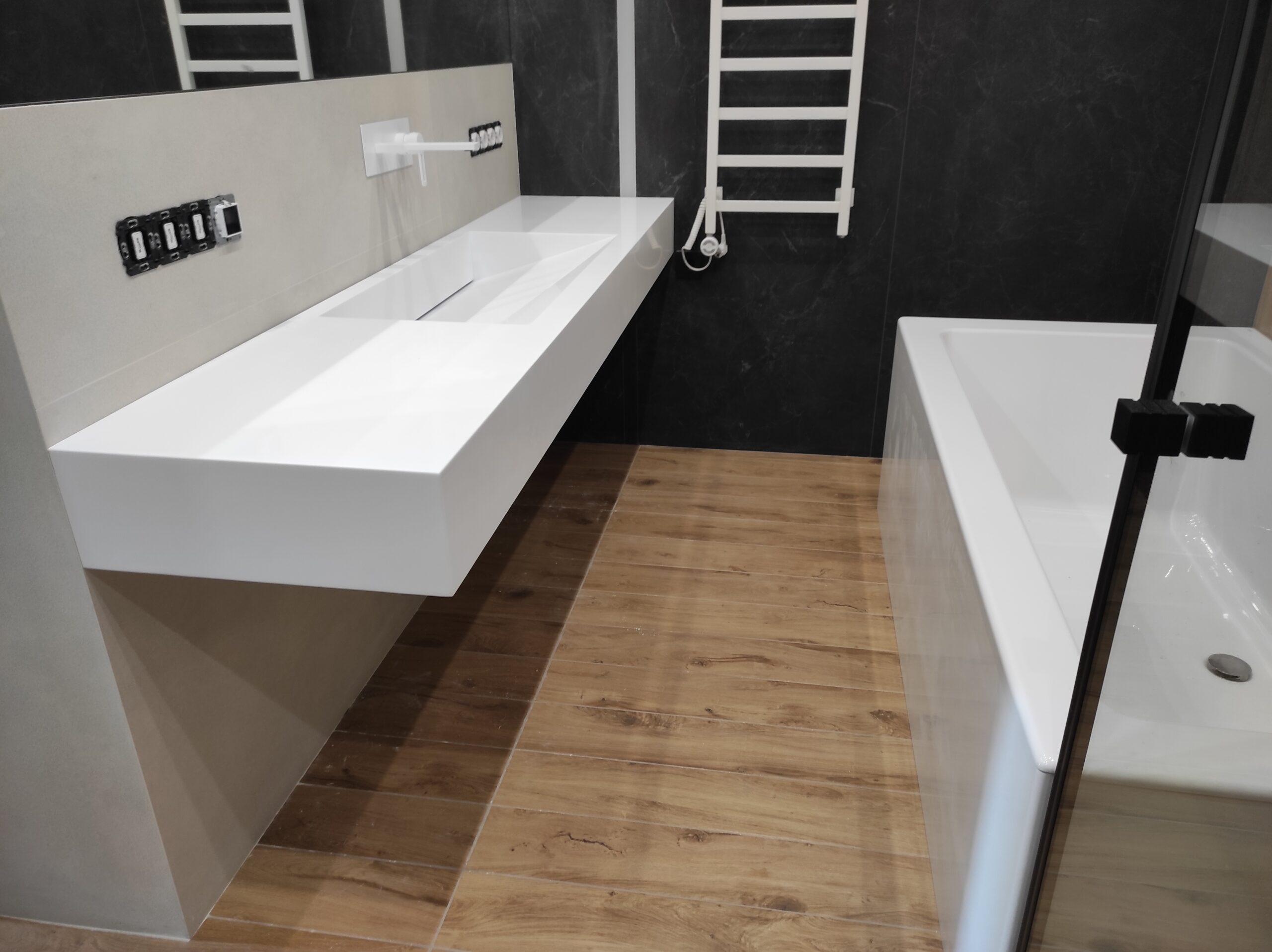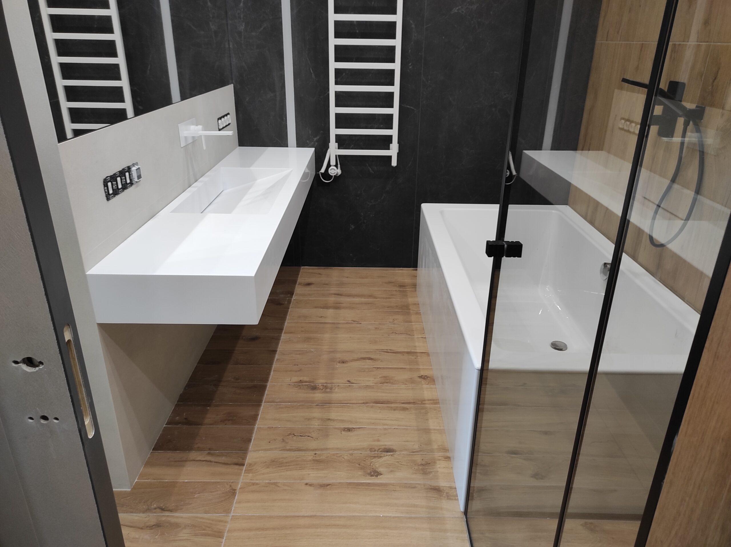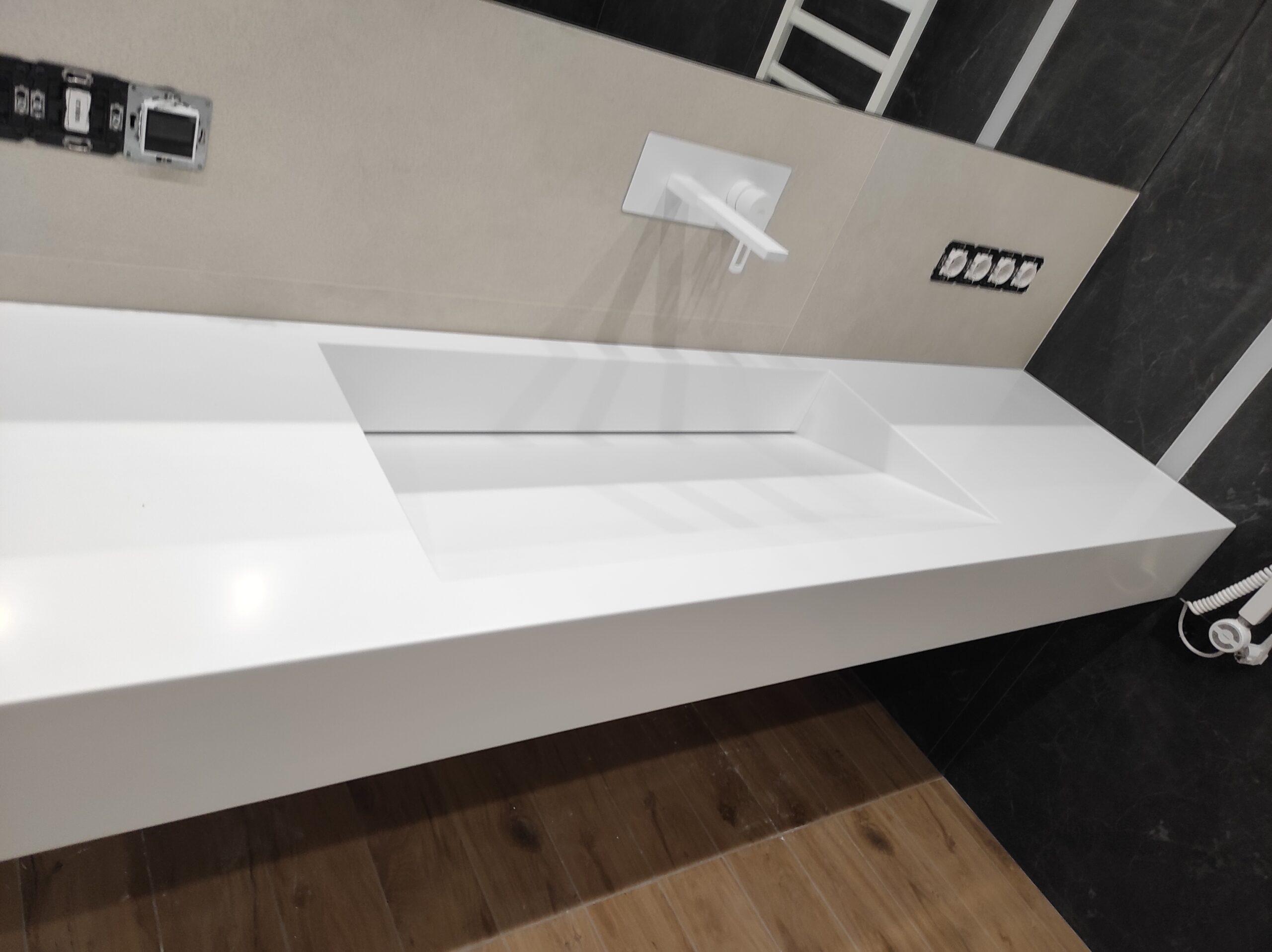 Экран на ванну и подвесная столешница с интегрированной раковиной из искусственного камня. Столешница установлена на кронштейны, а раковина выполнена в щелевом стиле. Для данного проекта был выбран камень из коллекции Pure Color (P) - это однотонный серый Grandex P-119 Whale White. Поверхность столешницы имеет глянцевую отделку, придавая всему композиции современный и изысканный вид.