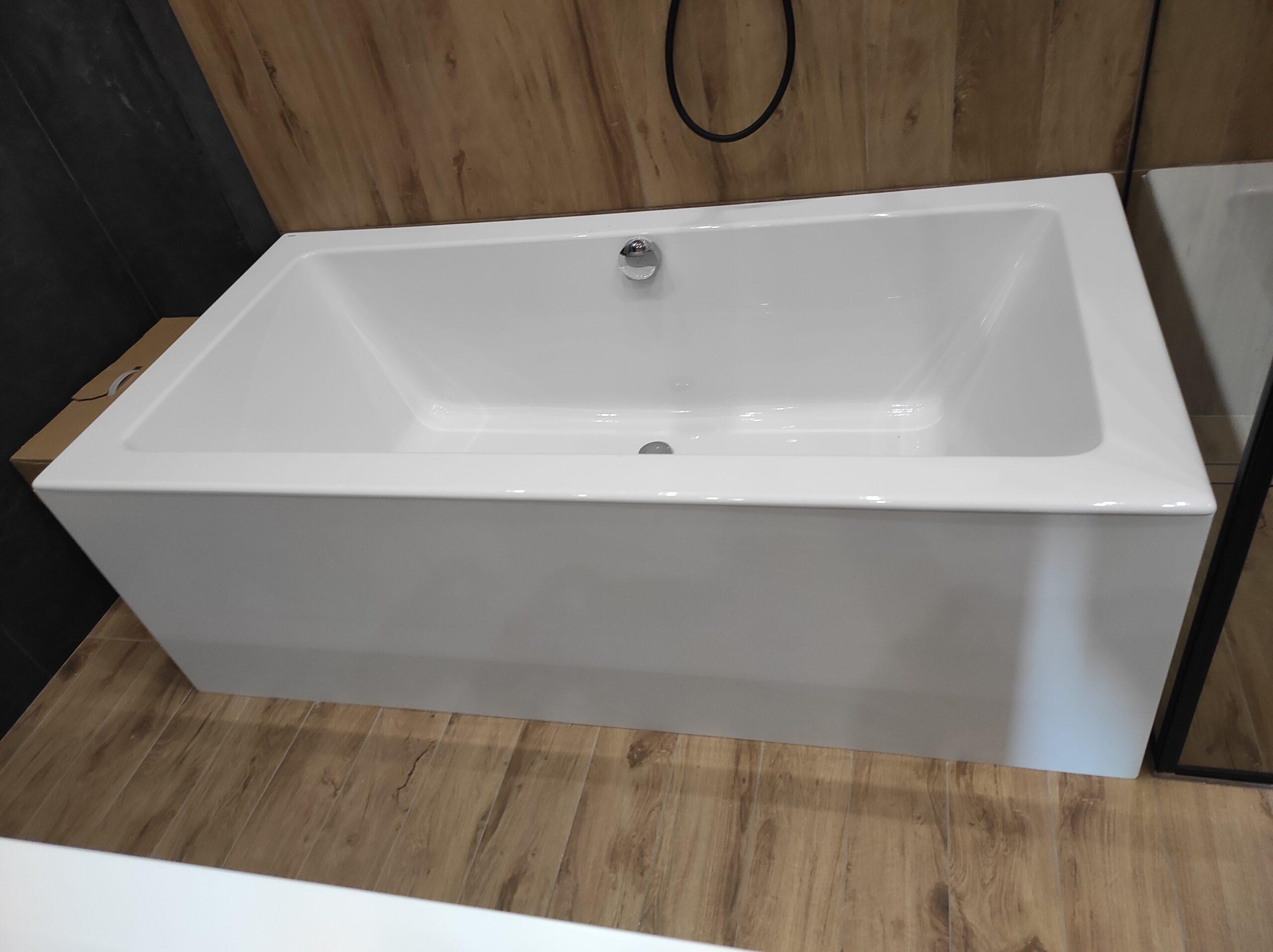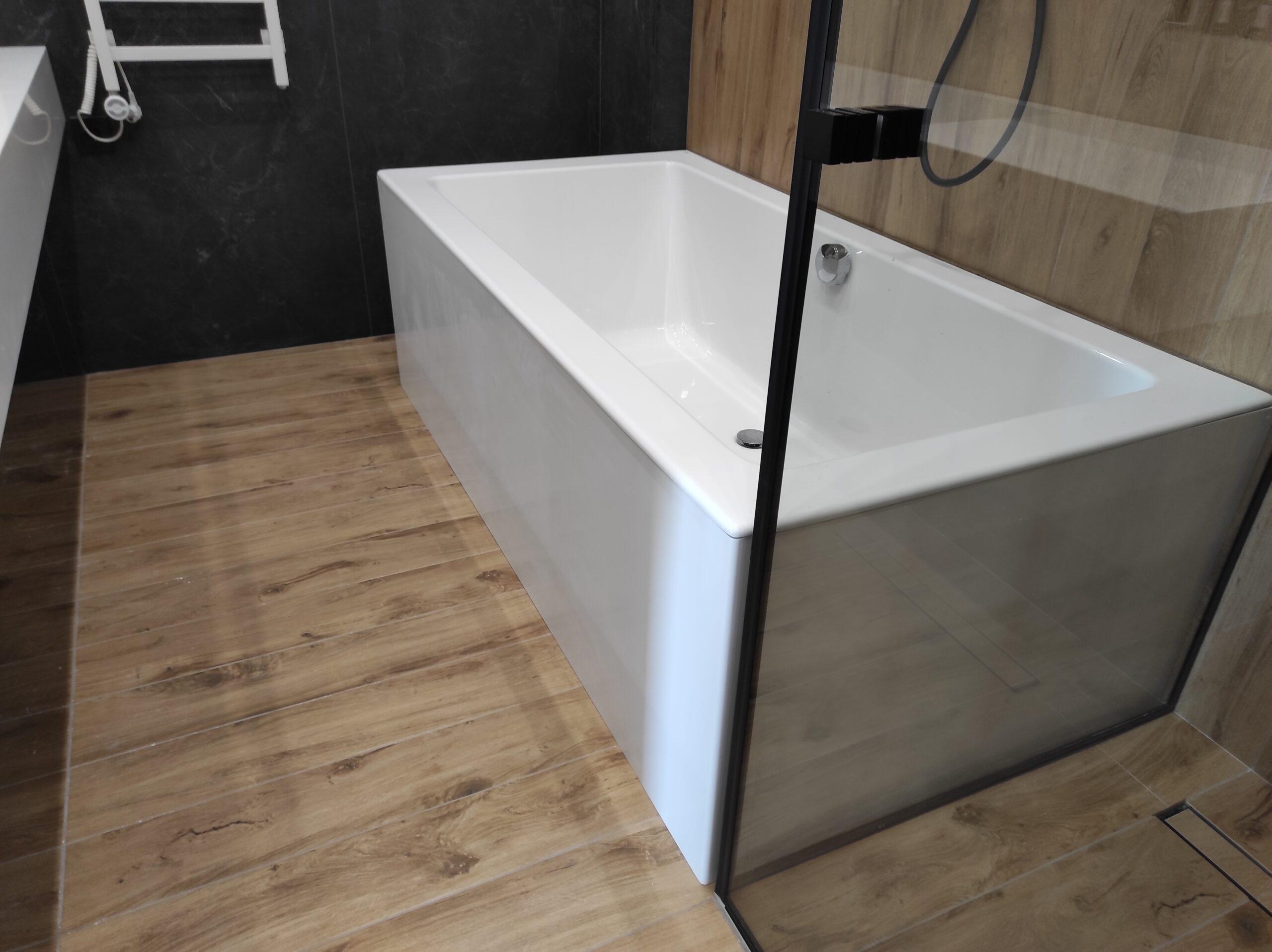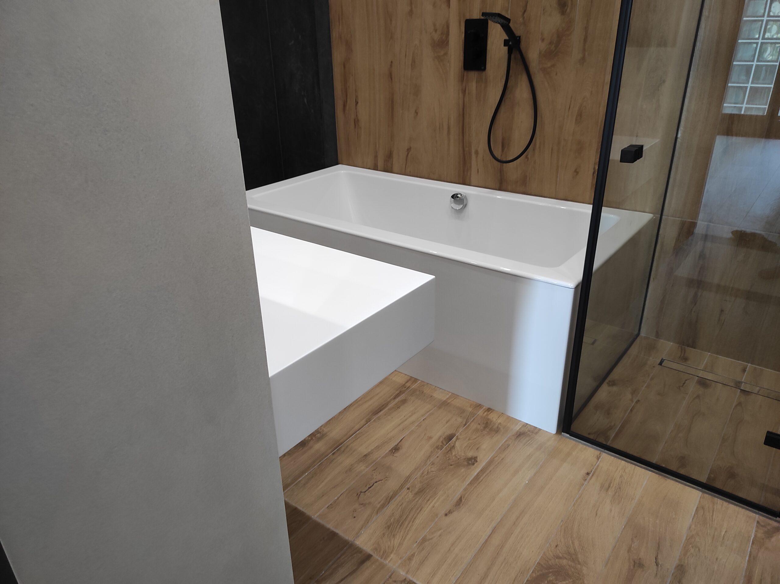 Экран на ванну и подвесная столешница с интегрированной раковиной из искусственного камня. Столешница установлена на кронштейны, а раковина выполнена в щелевом стиле. Для данного проекта был выбран камень из коллекции Pure Color (P) - это однотонный серый Grandex P-119 Whale White. Поверхность столешницы имеет глянцевую отделку, придавая всему композиции современный и изысканный вид.
