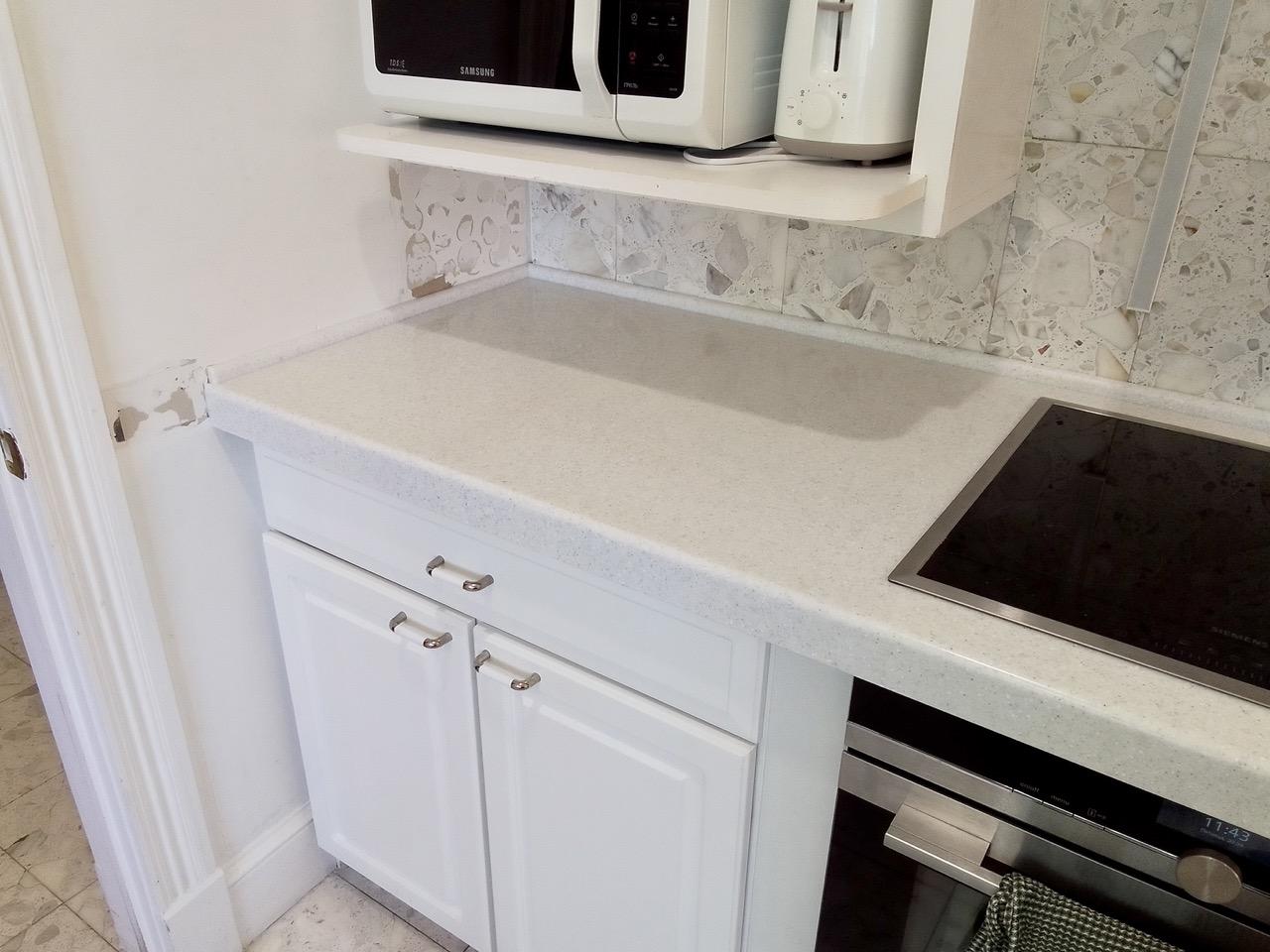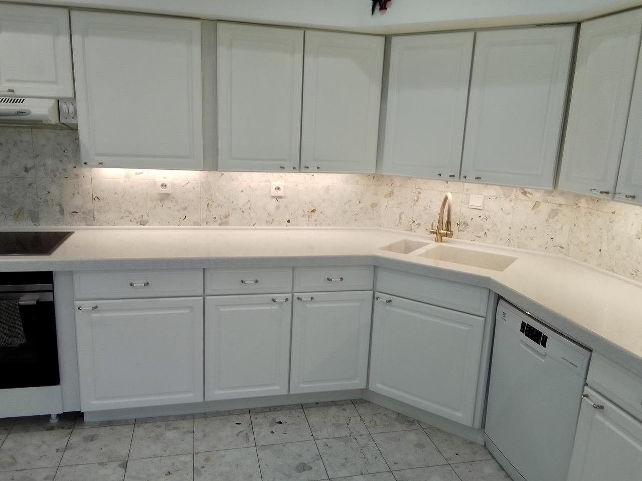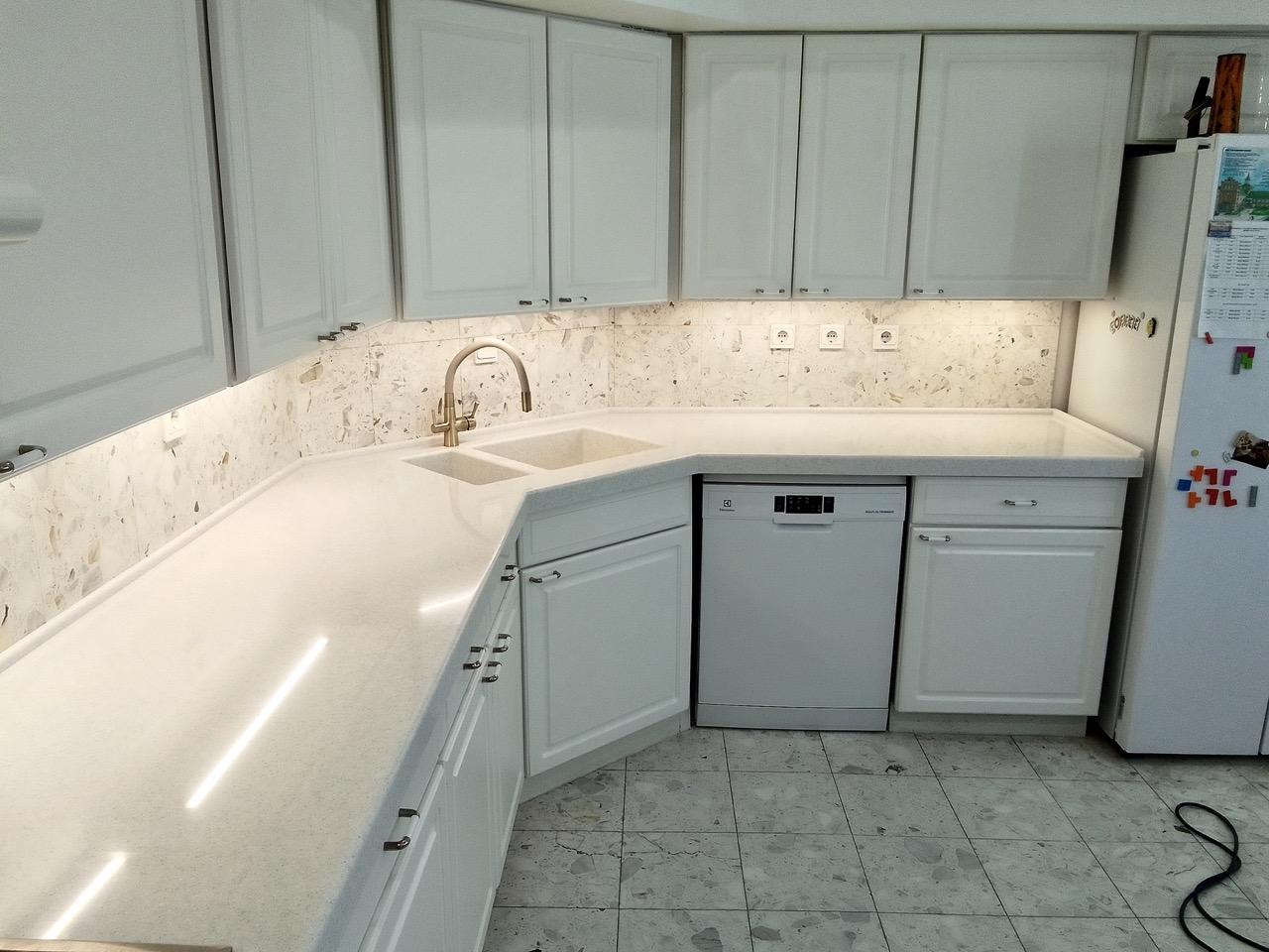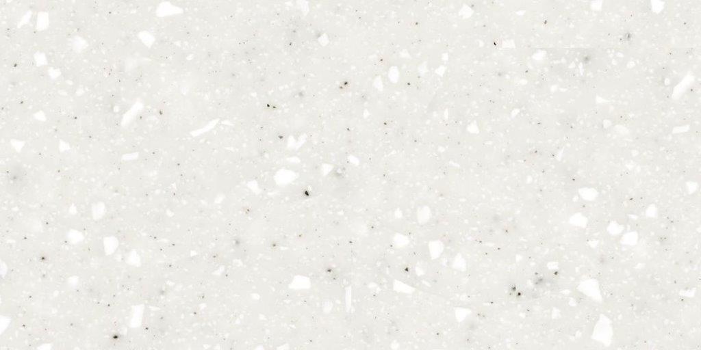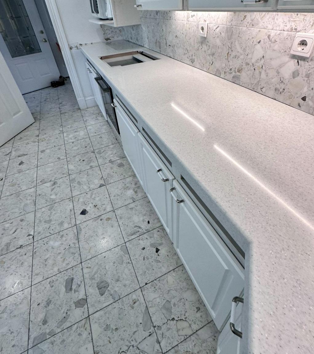 По периметру установили пристенный плинтус.Поверхность камня глянцевая, цвет - Hanex T-050 Ice Queen.