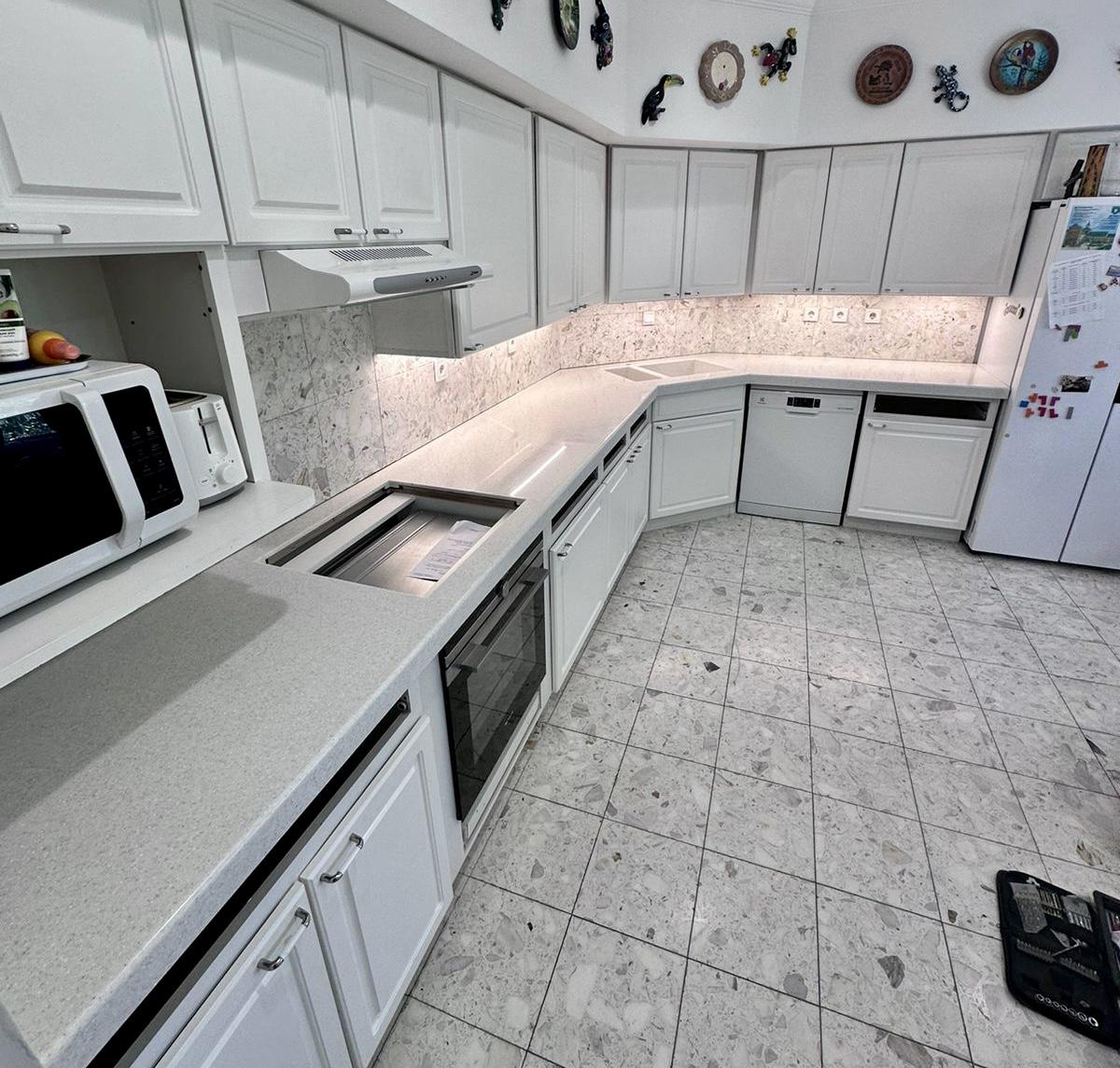 Угловая бесшовная столешница сделана из серого акрилового камня. Заказчики решили дополнить ее двойной мойкой из того же камня, что и столешница.