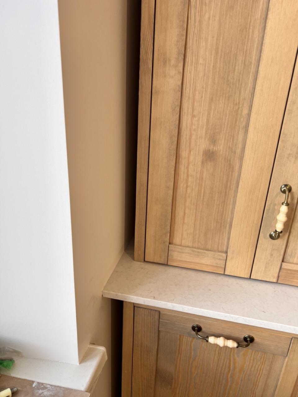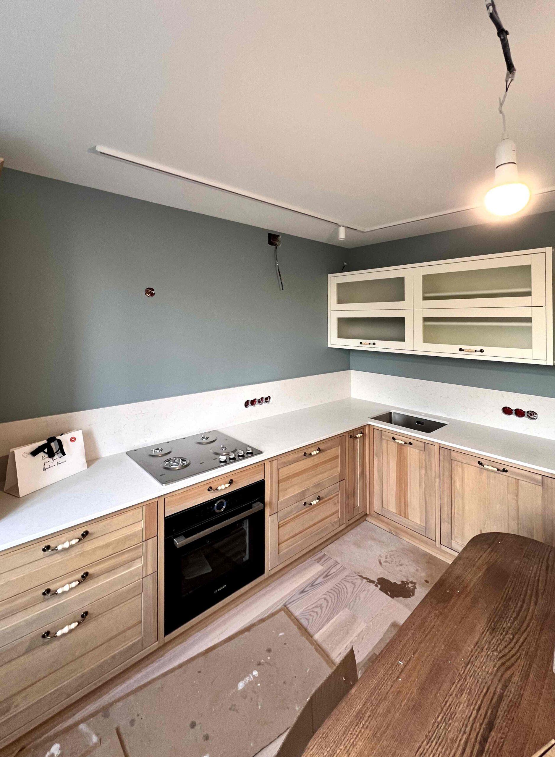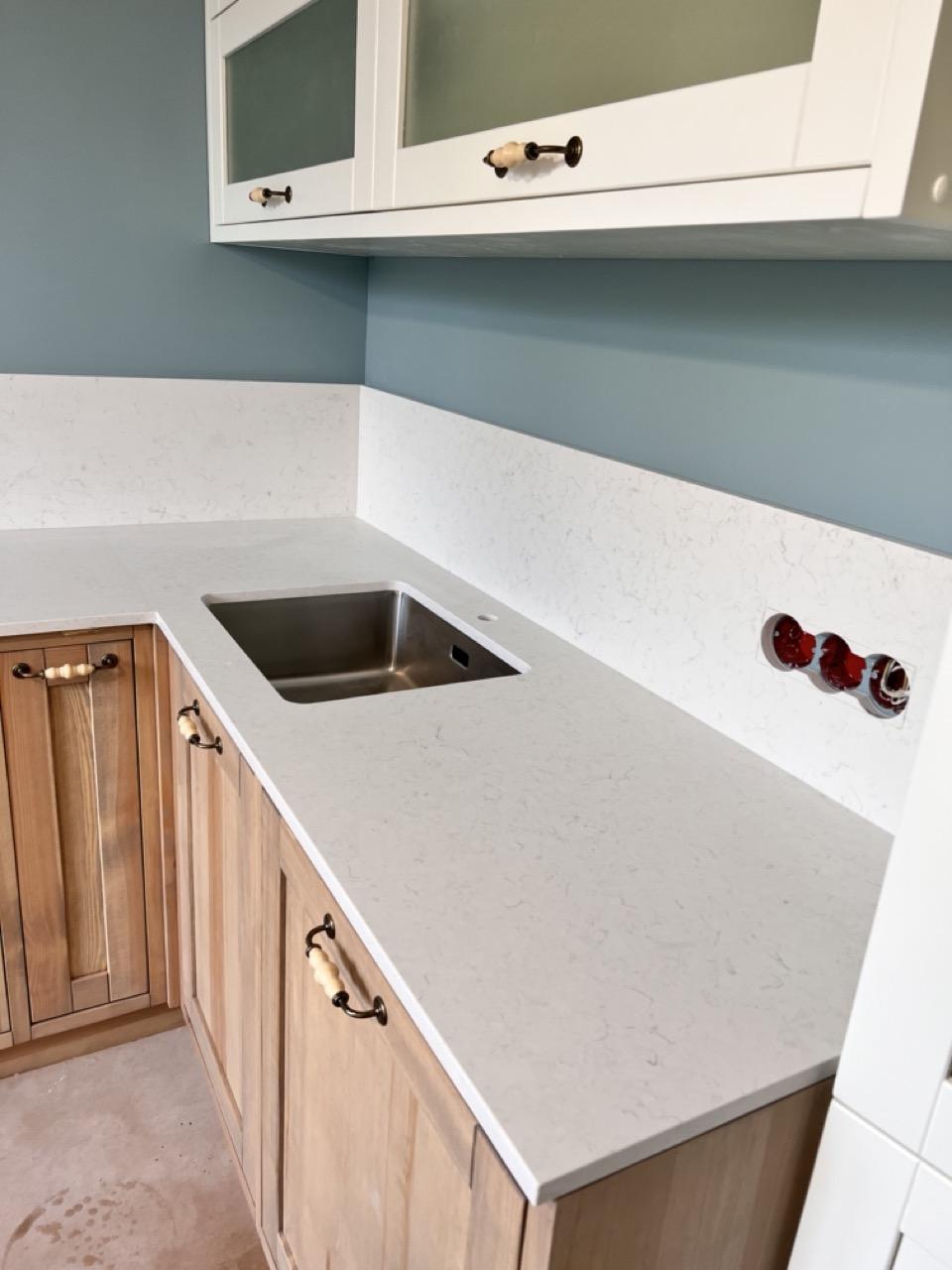 Угловая столешница и фартук изготовлены из твердого и прочного кварцевого агломерата российского бренда Avarus R543 Пик Эльбруса. Столешница на кухню из данного камня – одно из лучших решений. Он устойчив к грязи и к царапинам.