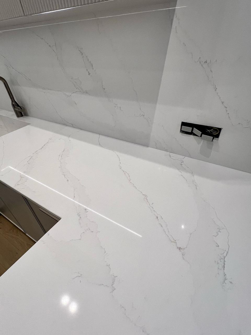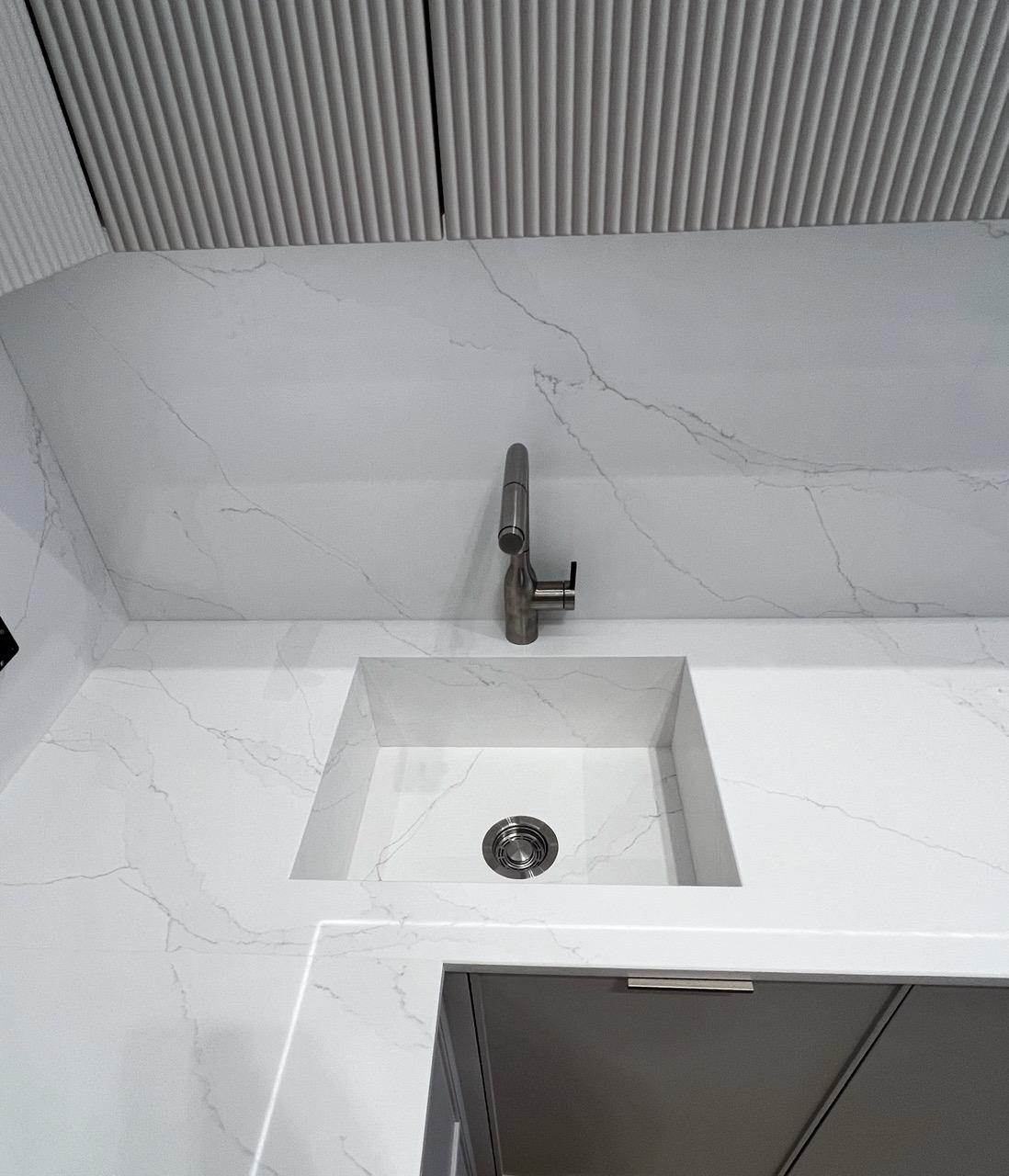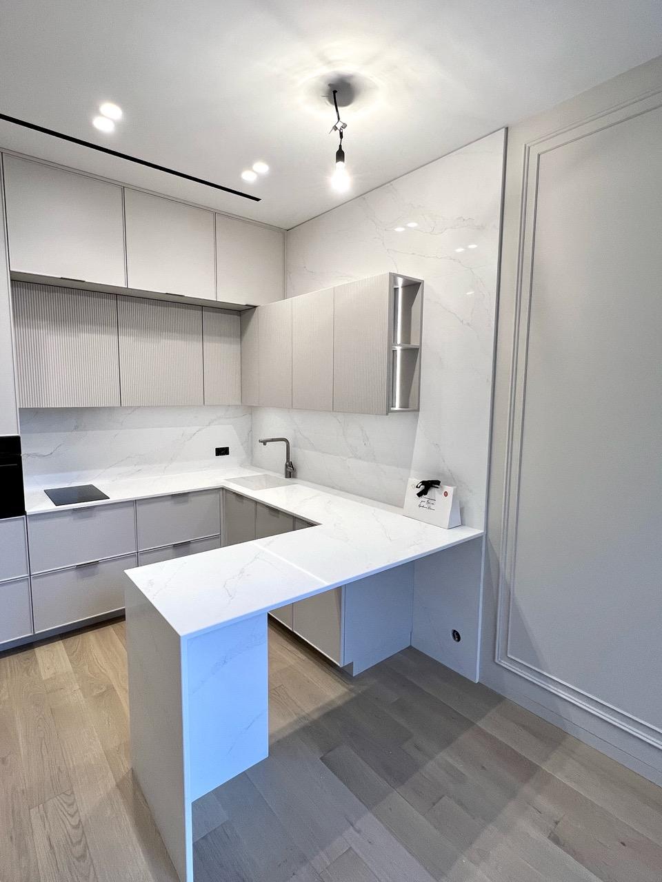 Кухонная столешница, мойка, стеновая панель и барная стойка из белого кварцевого агломерата