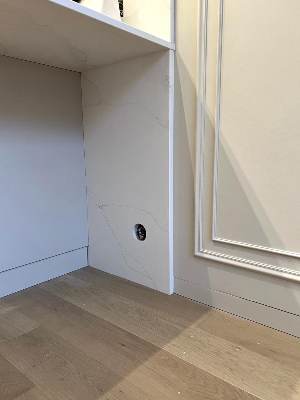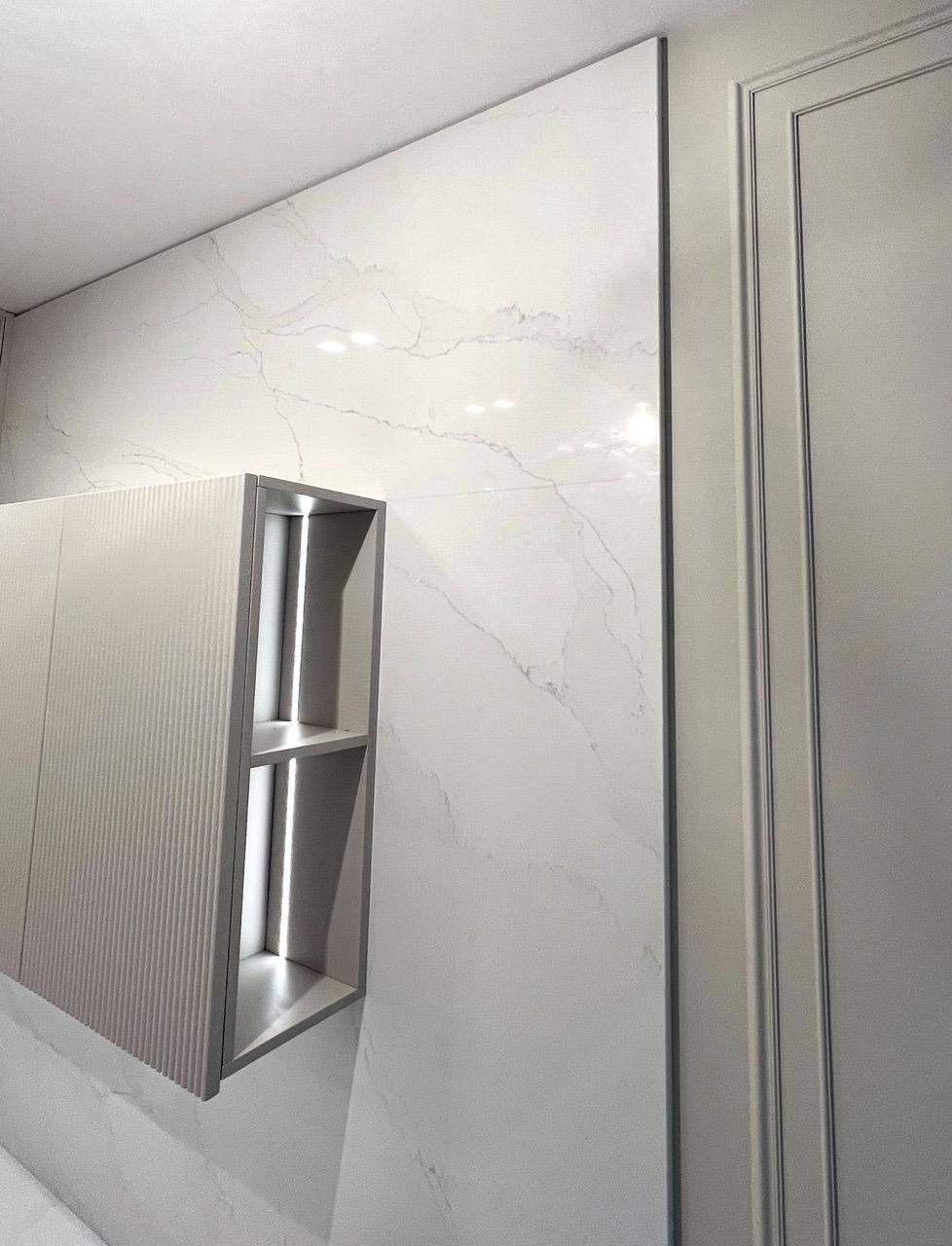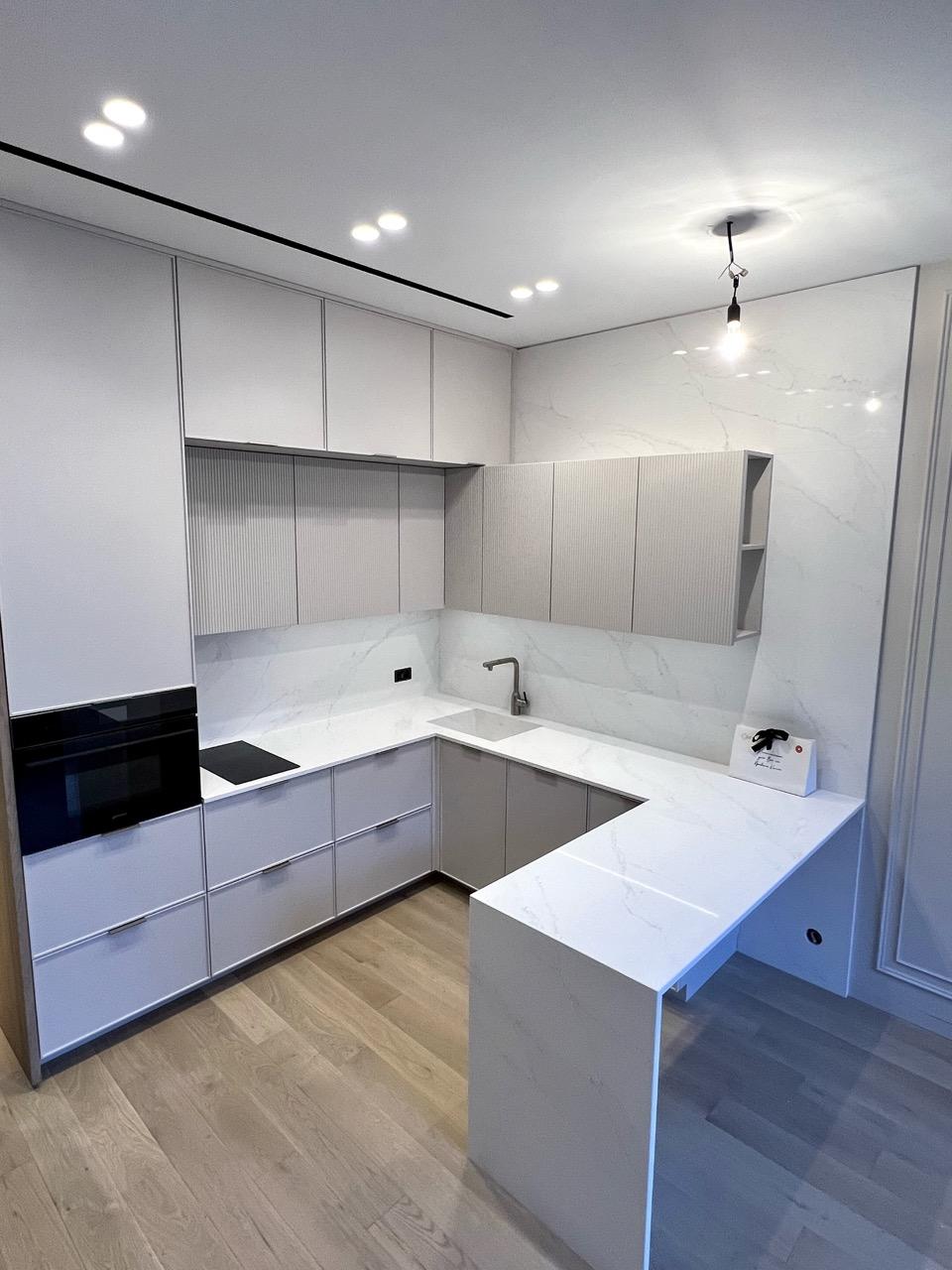 Кухонная столешница, мойка, стеновая панель и барная стойка из белого кварцевого агломерата