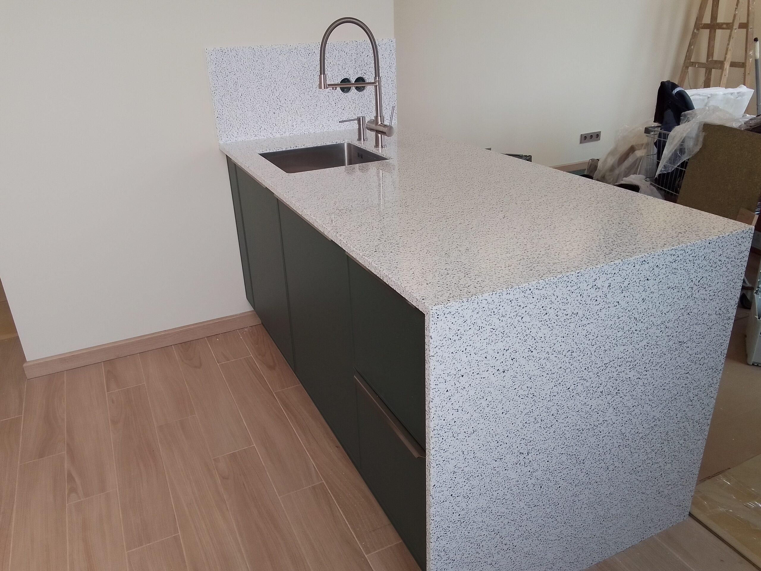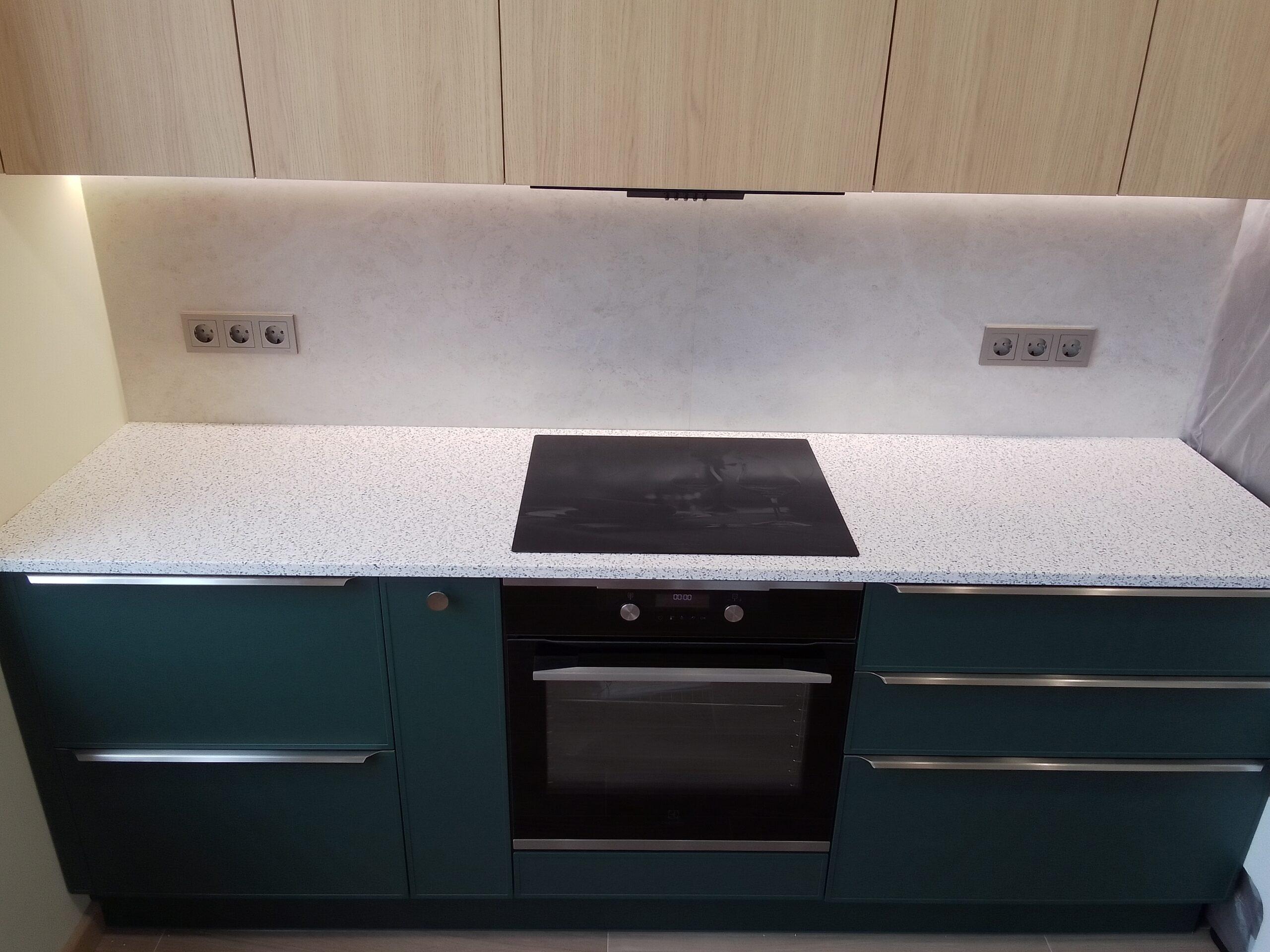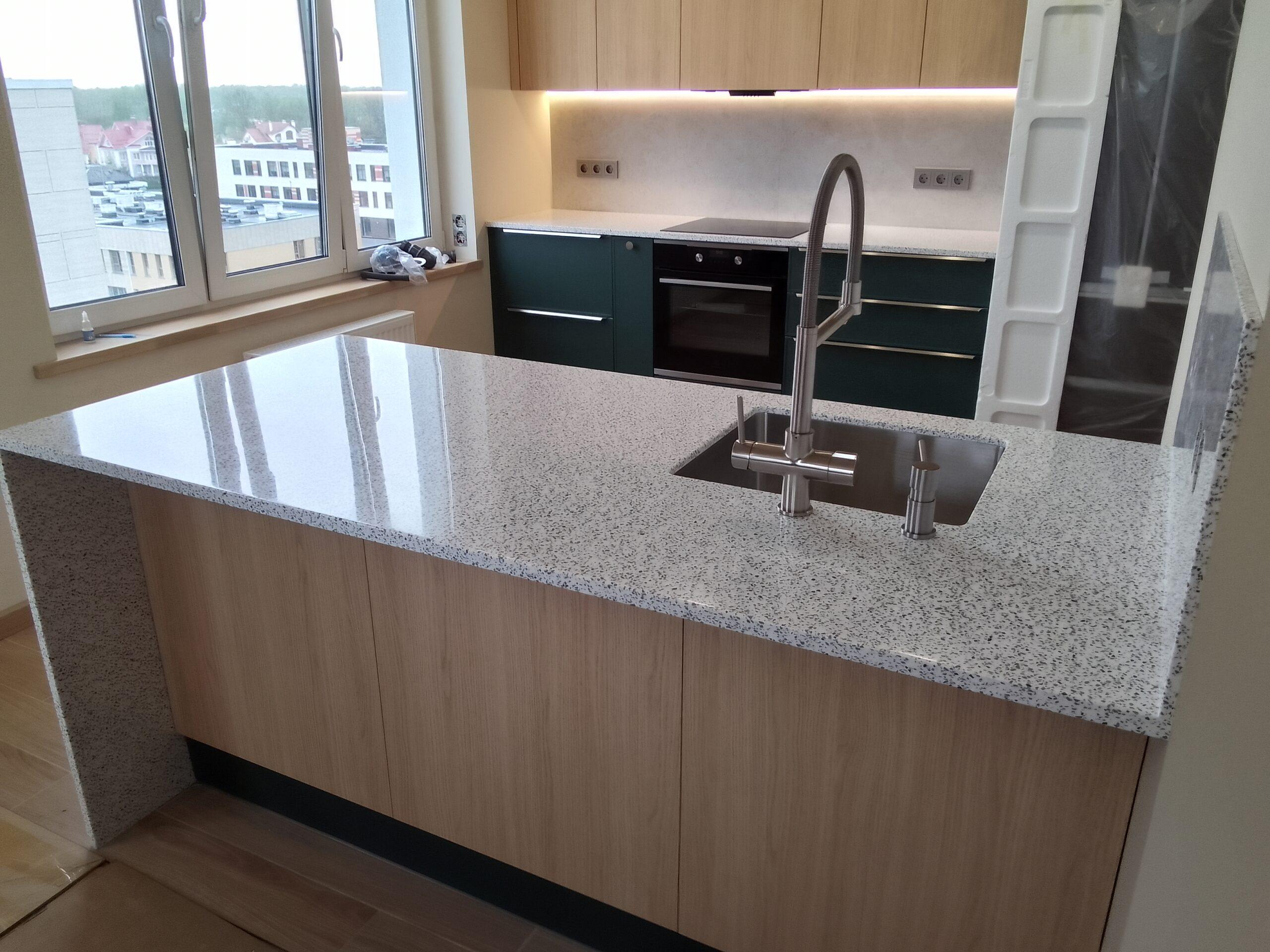 Кухонная столешница на гарнитур и столешница с опорой и стеновой панелью на остров из акрилового камня