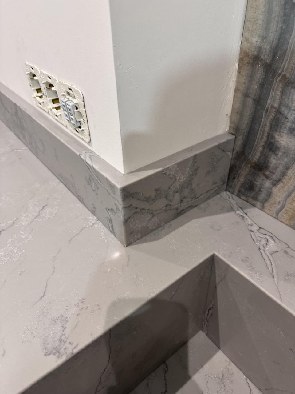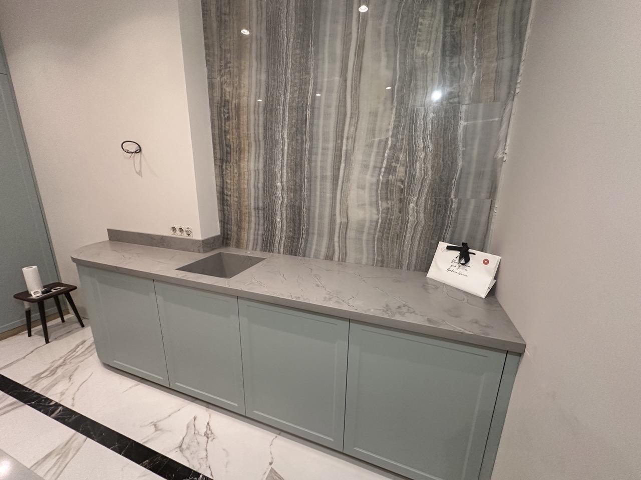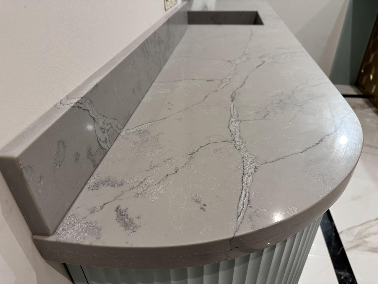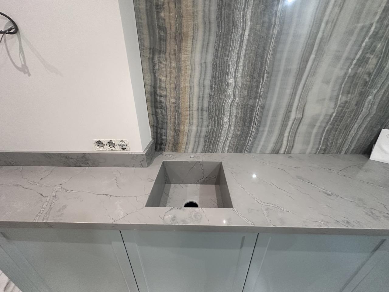Для изделий клиенты предпочли кварцевый агломерат Avant 7040 Калакатта Бомениль. Серый камень с мраморным рисунком отлично смотрится.