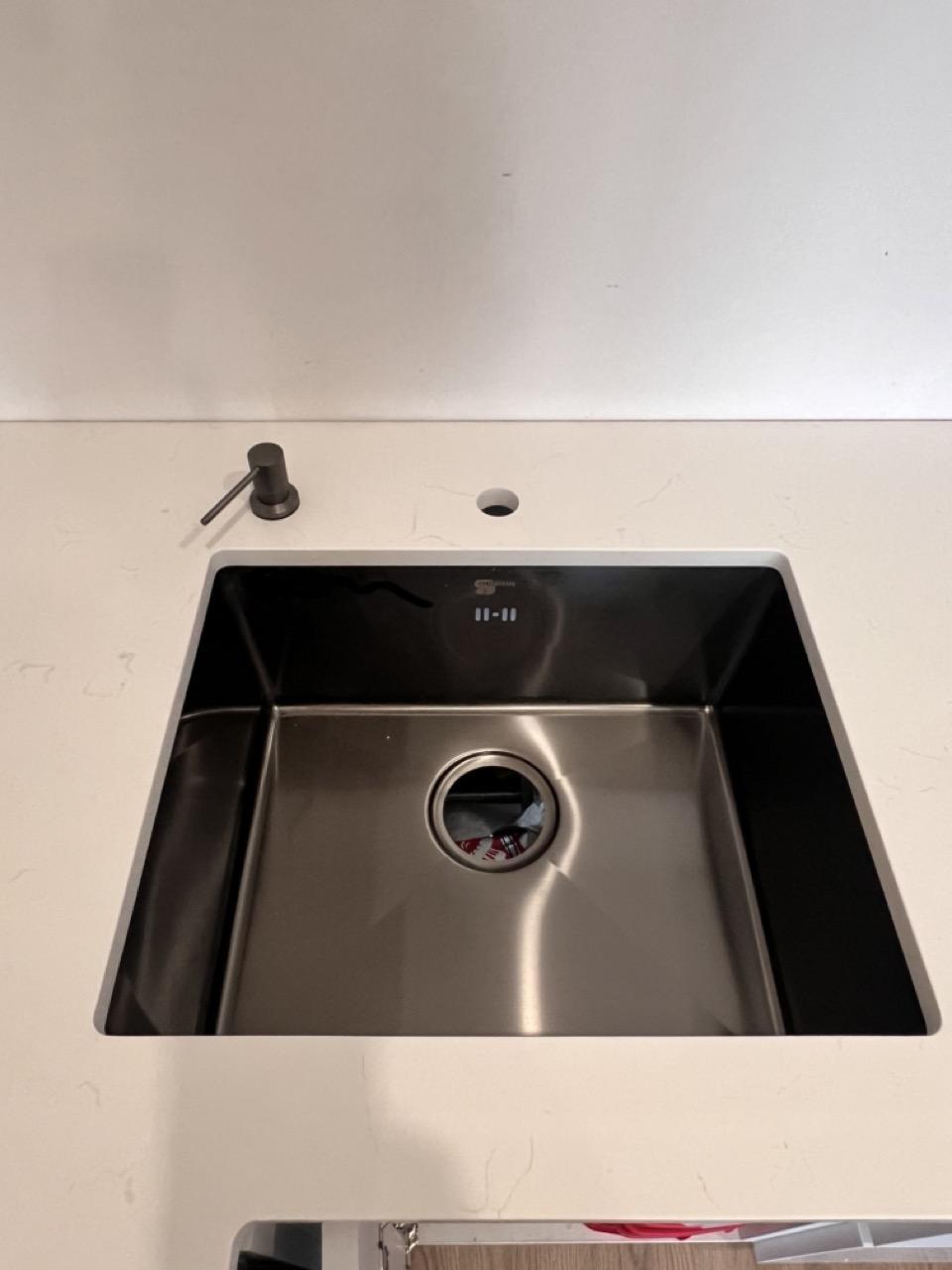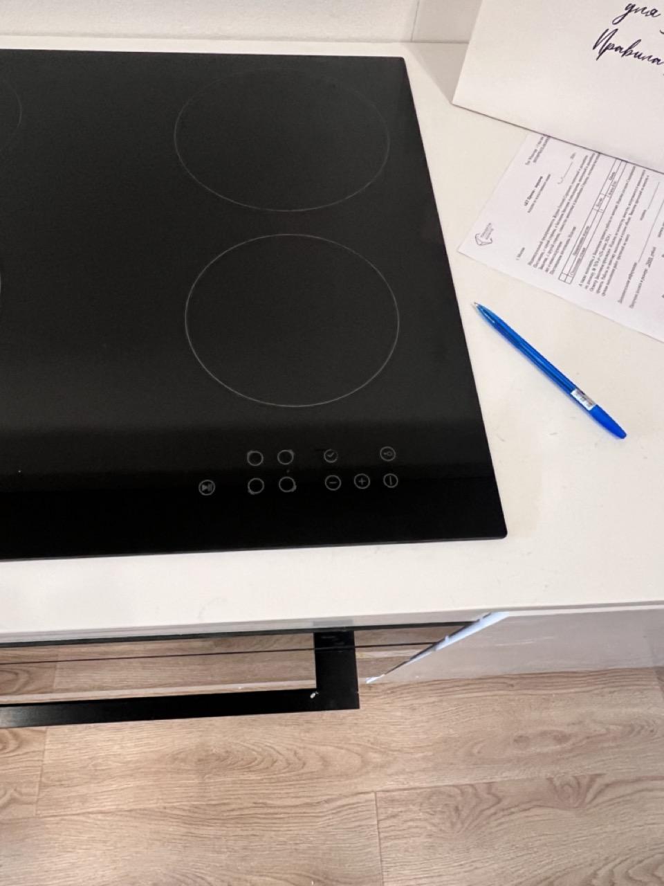 Его сделали около варочной поверхности. Благодаря этому, тоненькую полосочку стыка практически не видно.