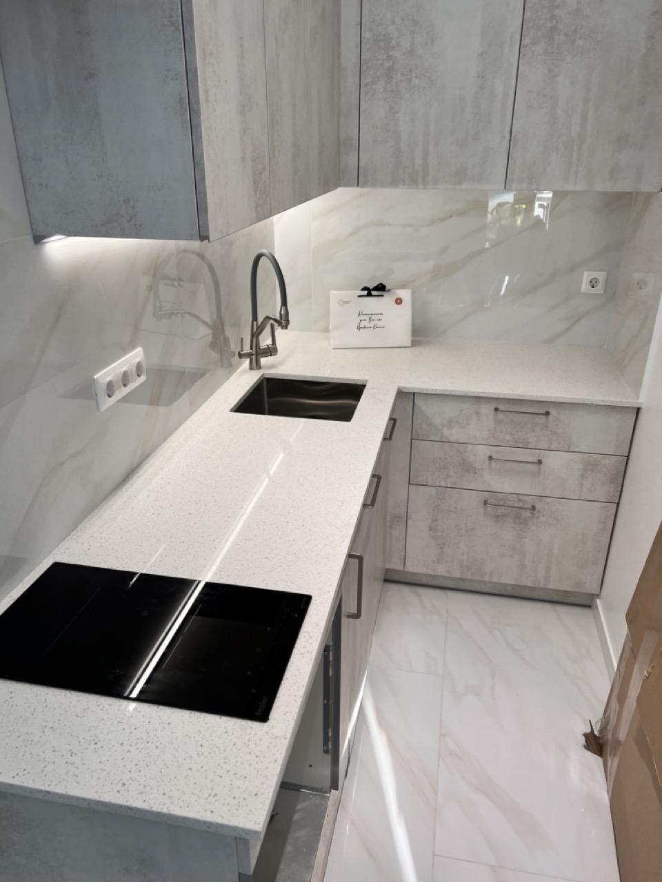 Белая кварцевая столешница отлично вписалась в интерьер. Рисунок с вкраплениями добавляет ей оригинальности.