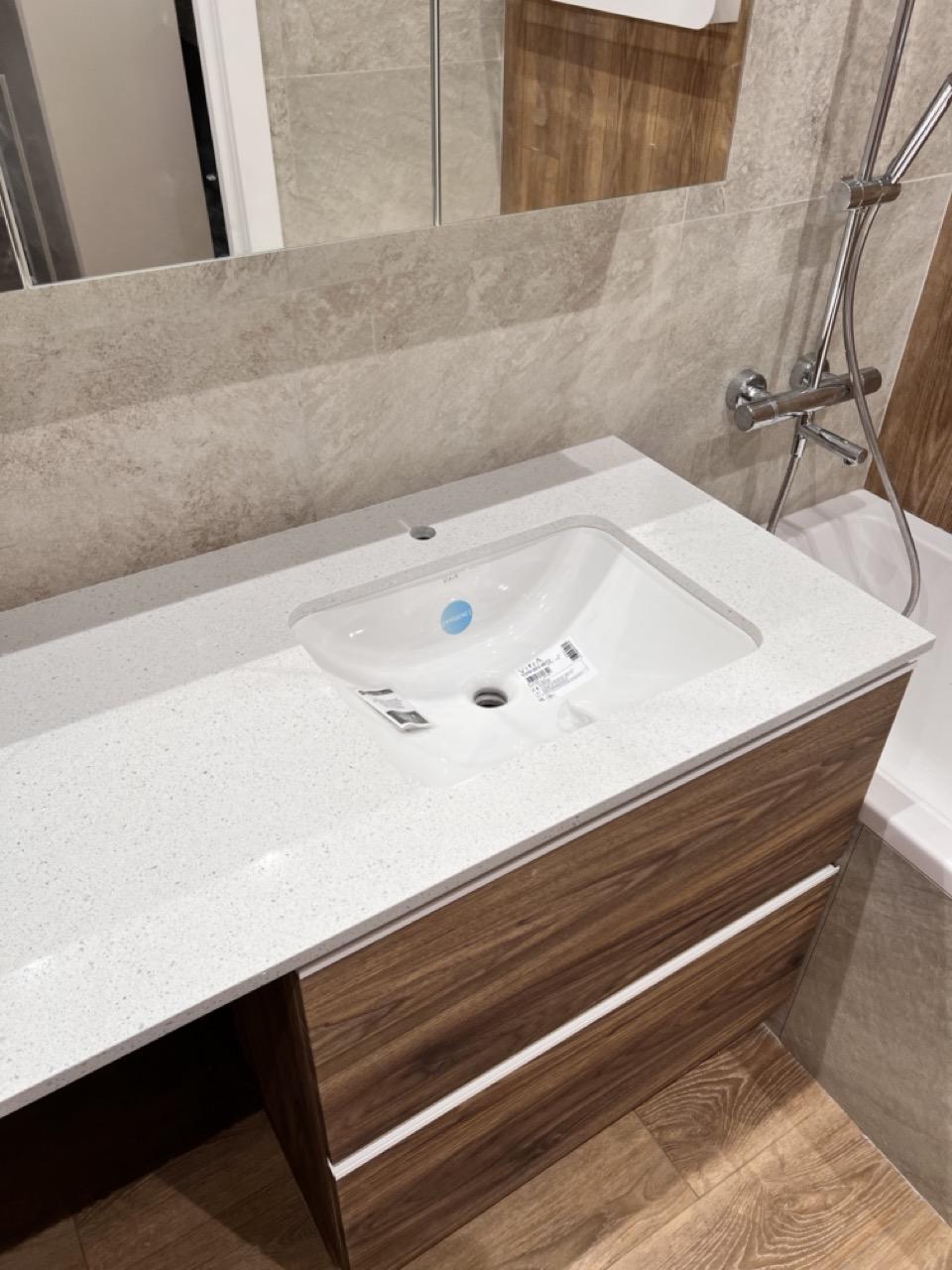 Столешница из кварцевого агломерата серого цвета дополнила интерьер ванной комнаты. Камень Belenco Kristella White 4262 с вкраплениями отлично сочетается с деревянными фасадами тумбы.