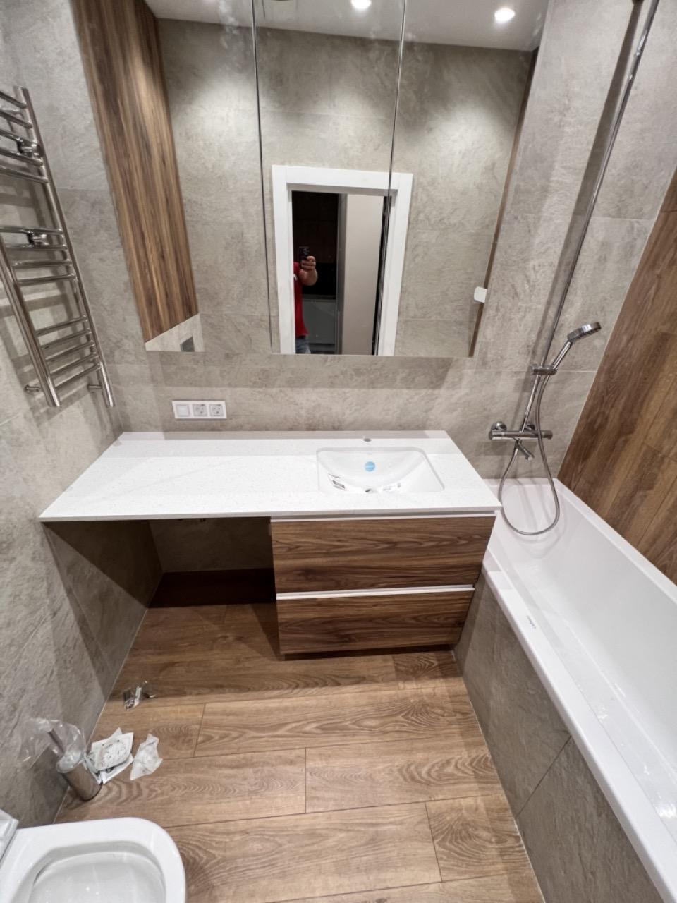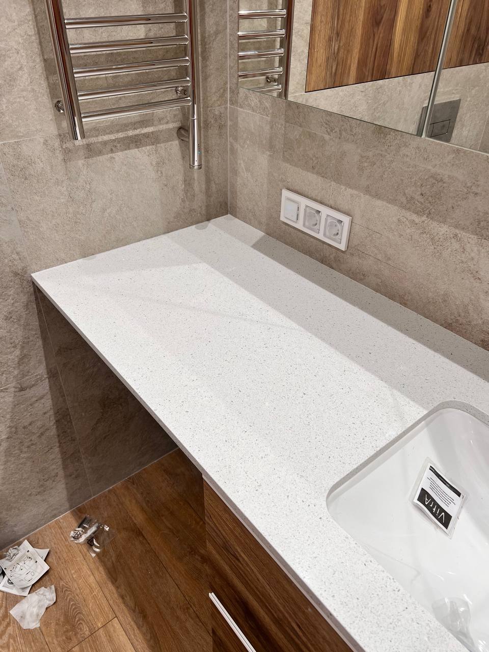 Столешница из кварцевого агломерата серого цвета дополнила интерьер ванной комнаты. Камень Belenco Kristella White 4262 с вкраплениями отлично сочетается с деревянными фасадами тумбы.