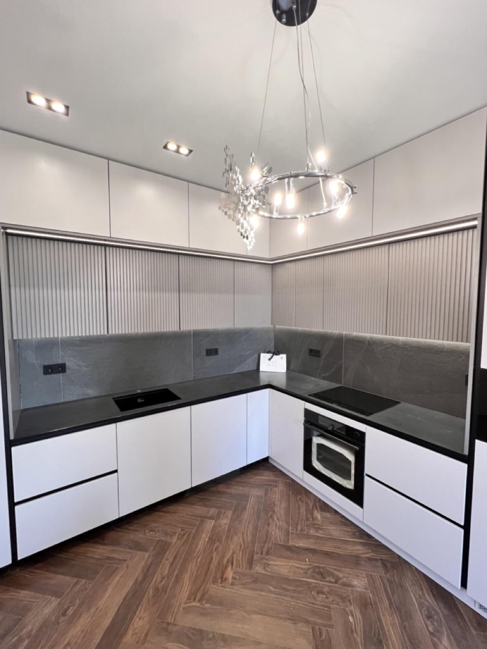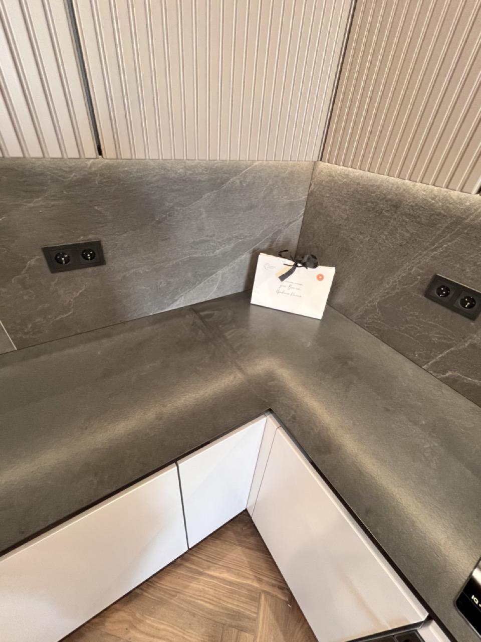 Он отлично сочетается с фартуком. При включенном свете камень выглядит не таким темным. Наши замерщики при необходимости привозят с собой образцы камня, чтобы вы могли выбрать наилучший вариант.