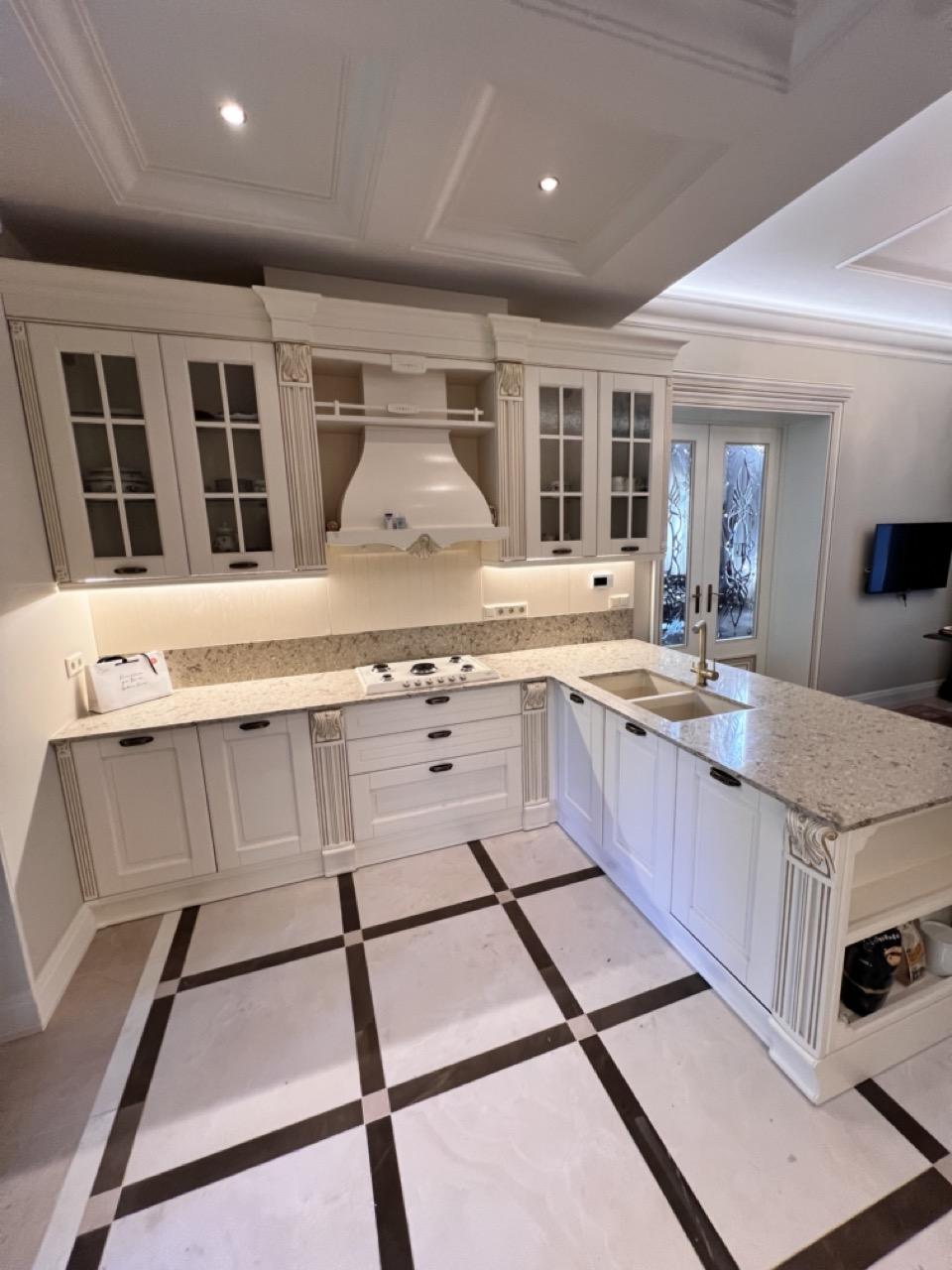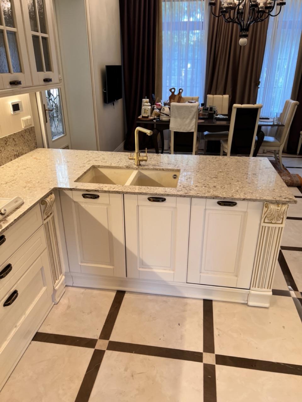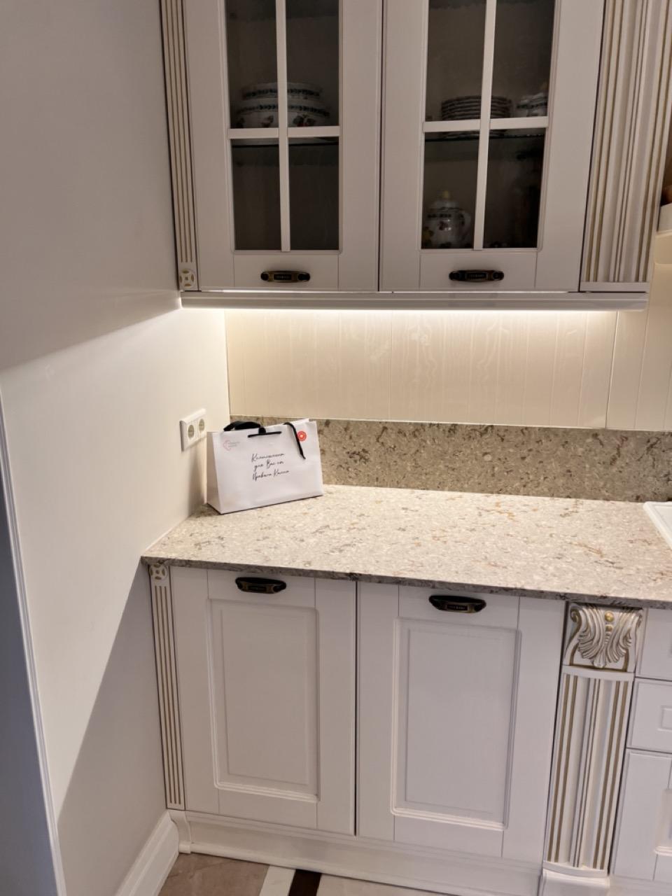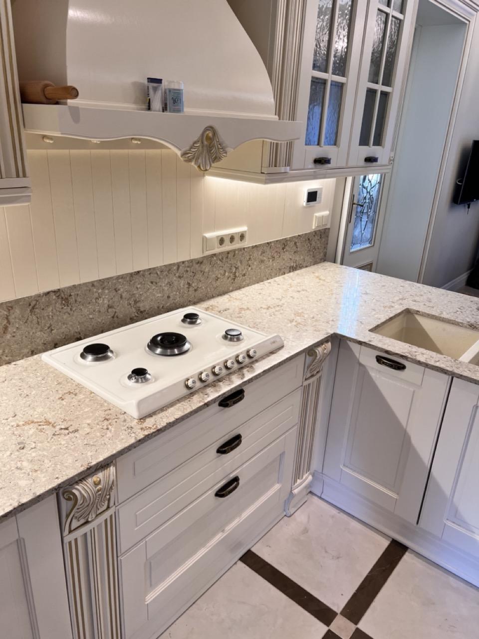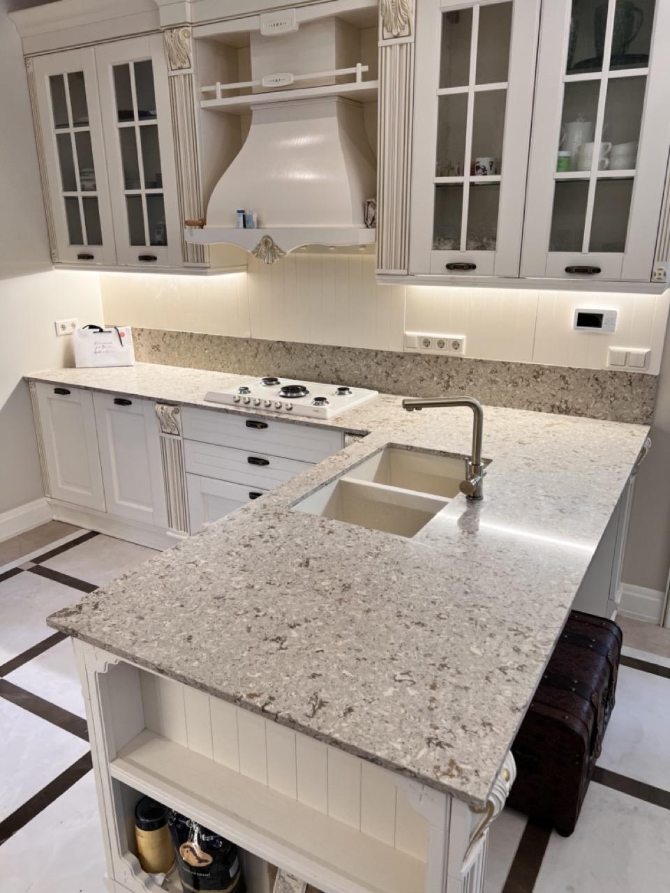 Кварцевый агломерат Avant Quartz 9010 Корсика бежевого цвета дополнил интерьер данной кухни. Именно из этого камня с мелкими прожилками сделаны 2 столешницы и стеновые панели.