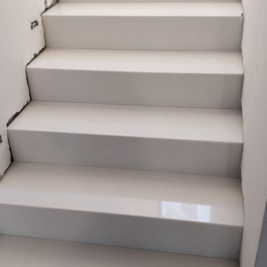 Лестницы из кварцевого агломерата отличаются особой прочностью и устойчивостью к высоким нагрузкам по проходимости: как в жилых, так и в общественных зданиях. 14 ступеней и 14 подступенков. Камень белый со средними вкраплениями - Avant Quartz 1220 Клермон. Поверхность глянцевая, но возможно изготовление и в матовом варианте.