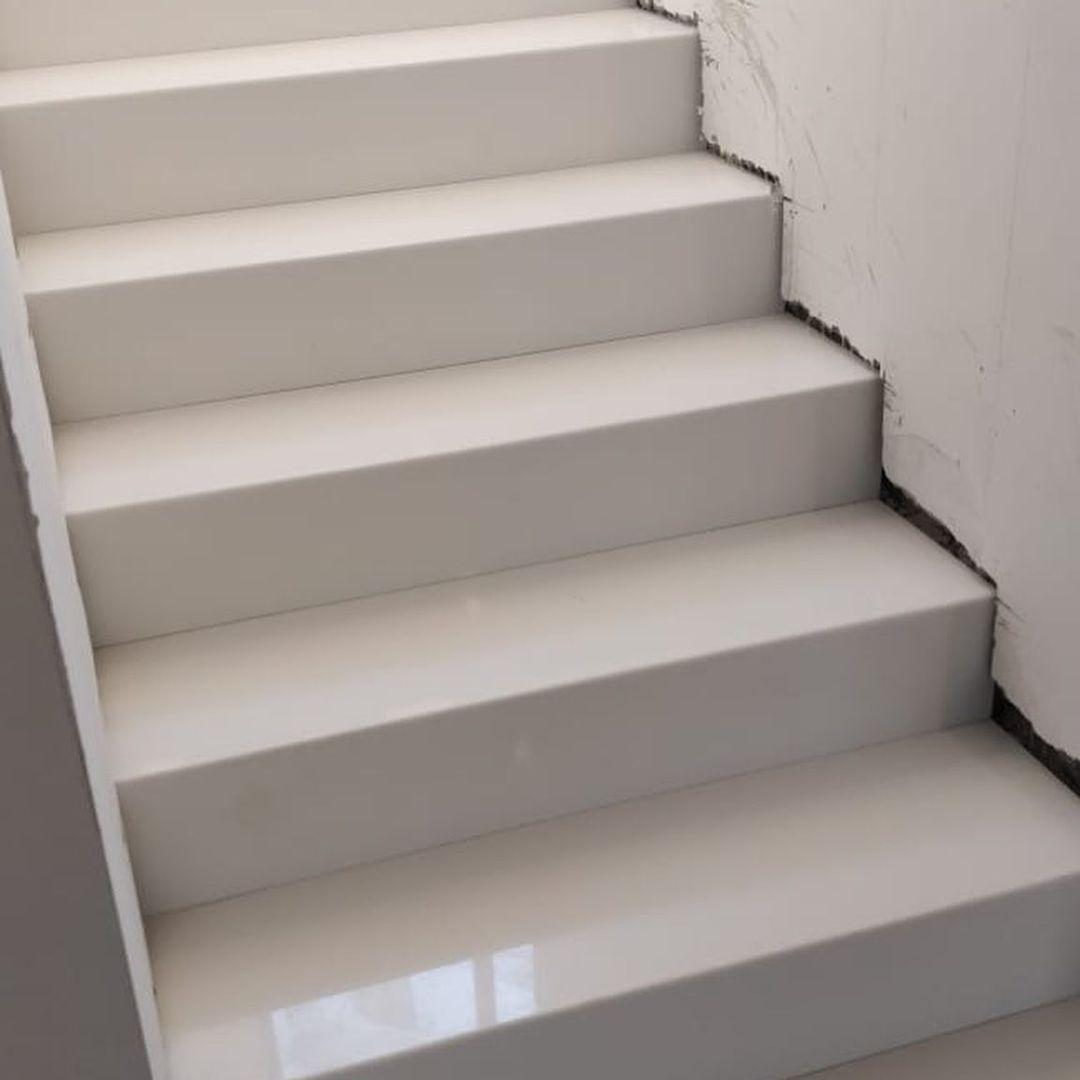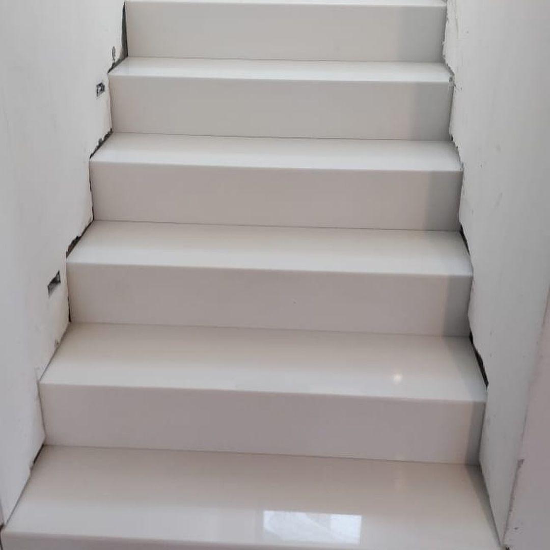 Лестницы из кварцевого агломерата отличаются особой прочностью и устойчивостью к высоким нагрузкам по проходимости: как в жилых, так и в общественных зданиях. 14 ступеней и 14 подступенков. Камень белый со средними вкраплениями - Avant Quartz 1220 Клермон. Поверхность глянцевая, но возможно изготовление и в матовом варианте.