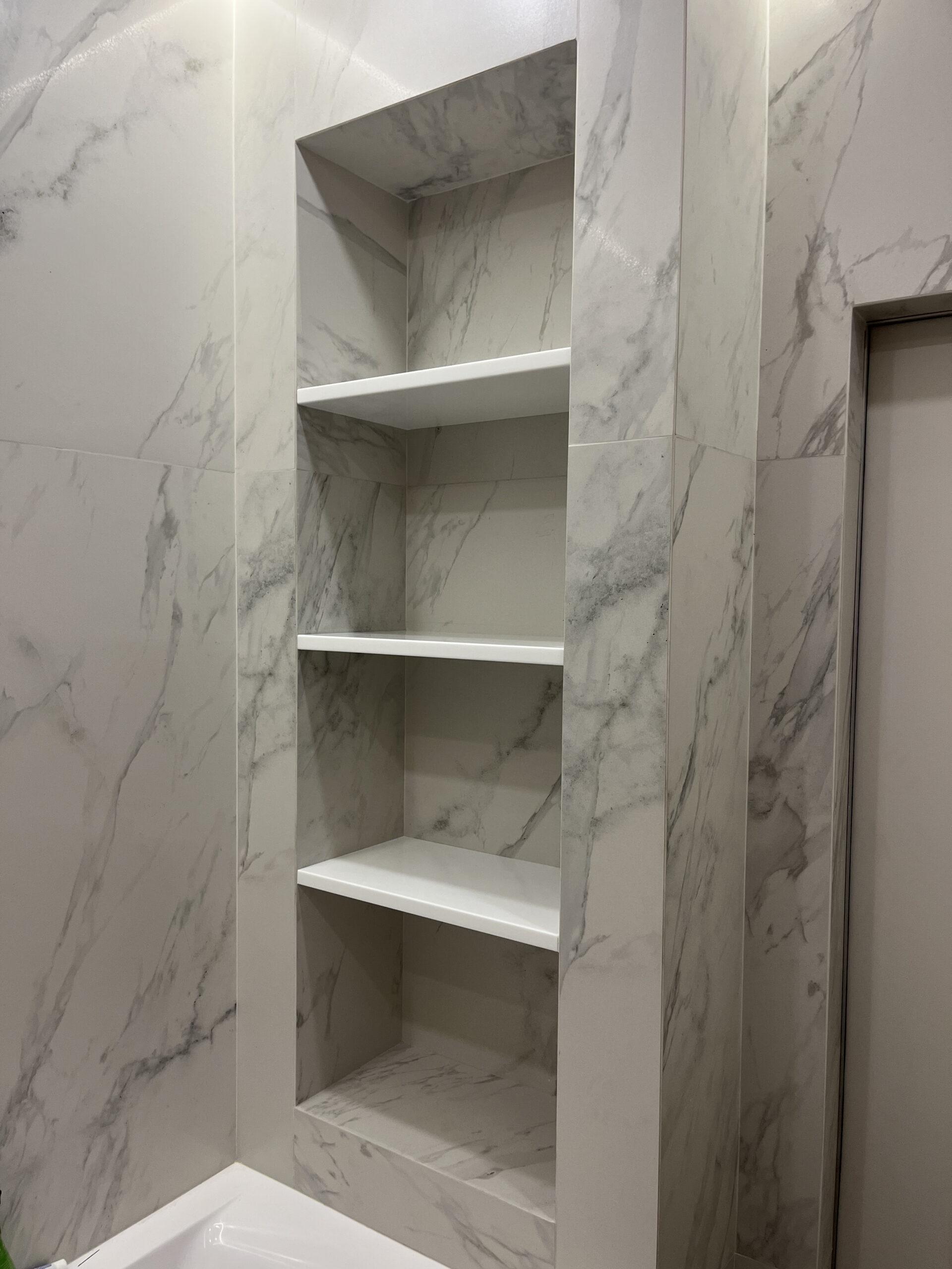 Две настольные раковины-чаши и полки из искусственного камня изготовлены мастерами нашей компании. Раковины можно сделать любой формы и размера. Для изделий клиенты выбрали белый однотонный камень из коллекции Pure Color (P) популярного бренда - Grandex P-104 Pure White. Столешница в ванную также сделана в нашей компании. Но для нее уже клиенты выбрали кварцевый агломерат белого цвета с крупными прожилками.
