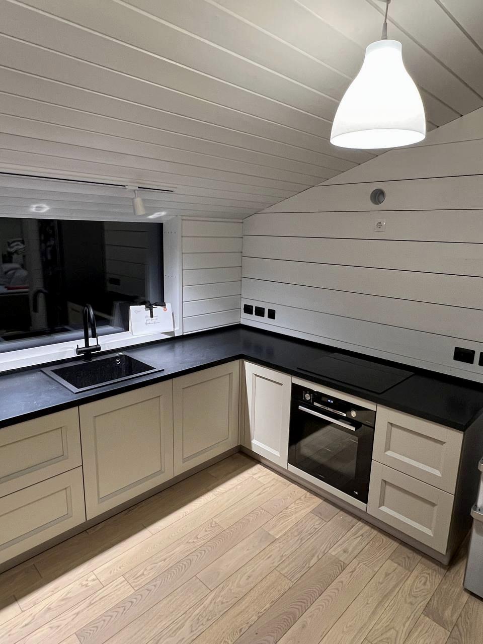 Темная угловая столешница изготовлена из кварцевого агломерата российского бренда Avarus RM510 Черное Море. Поверхность — матовая.