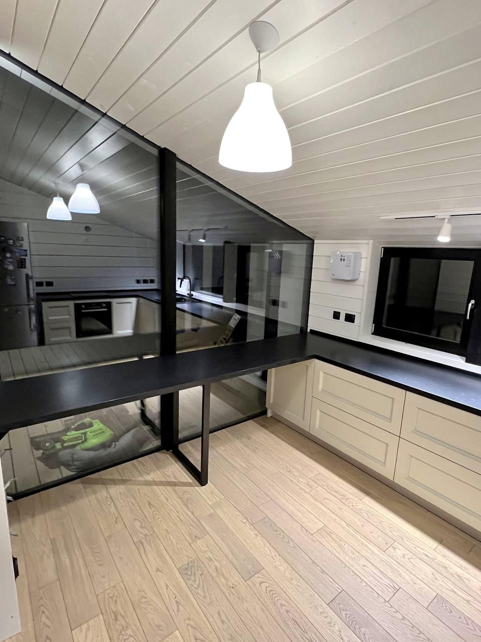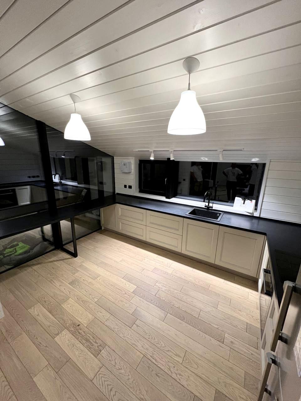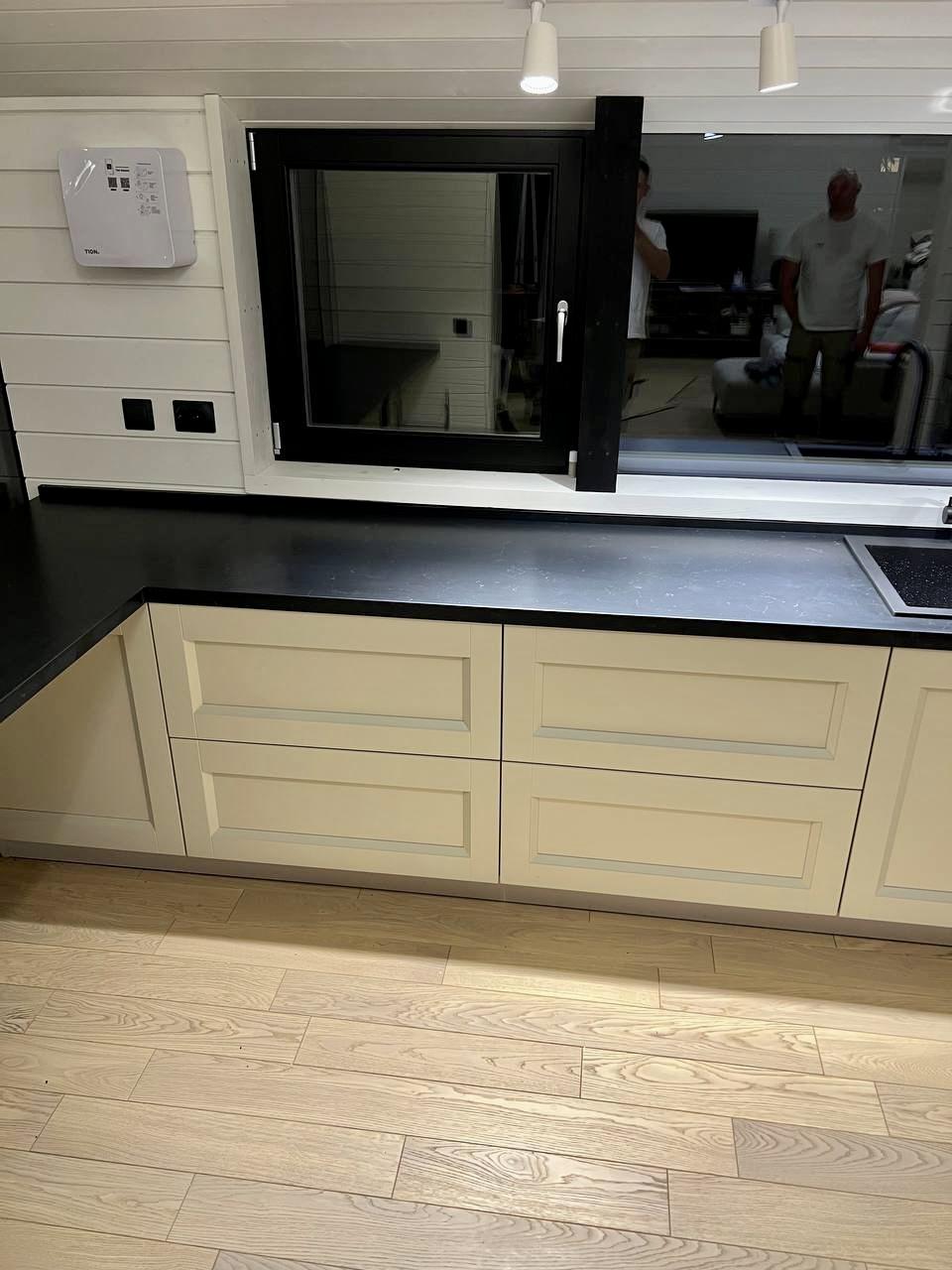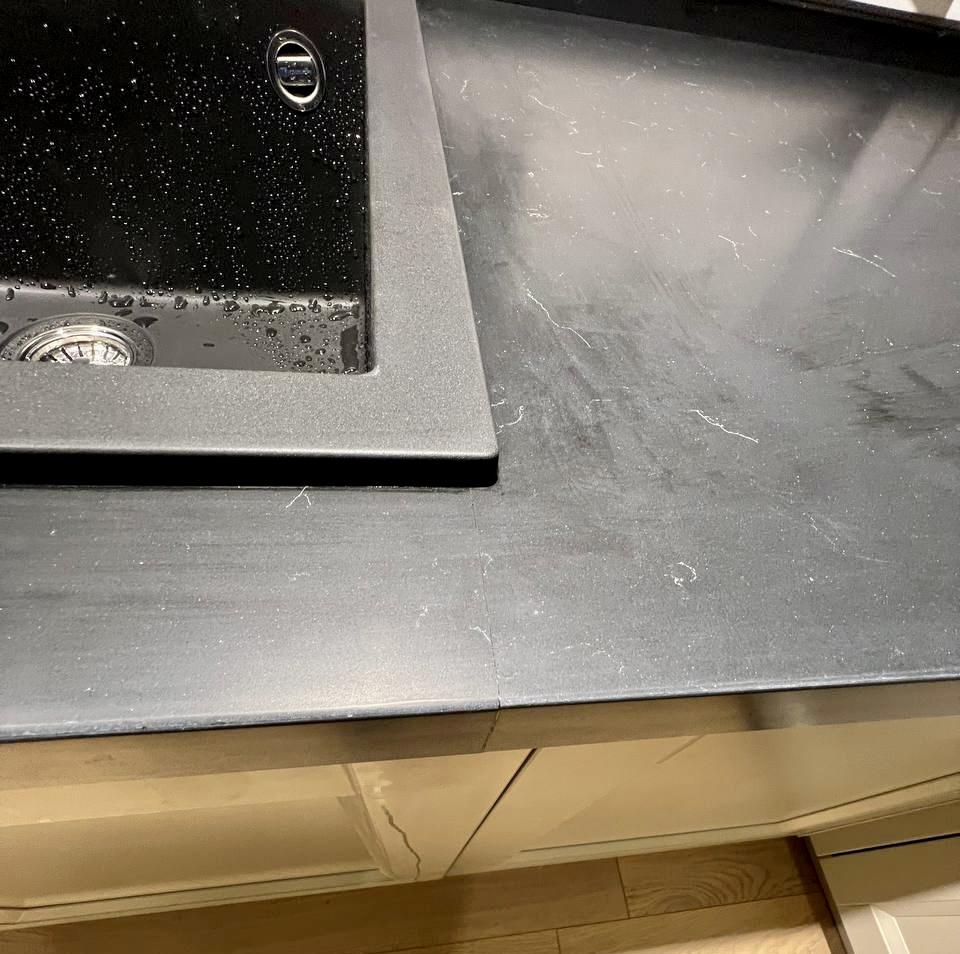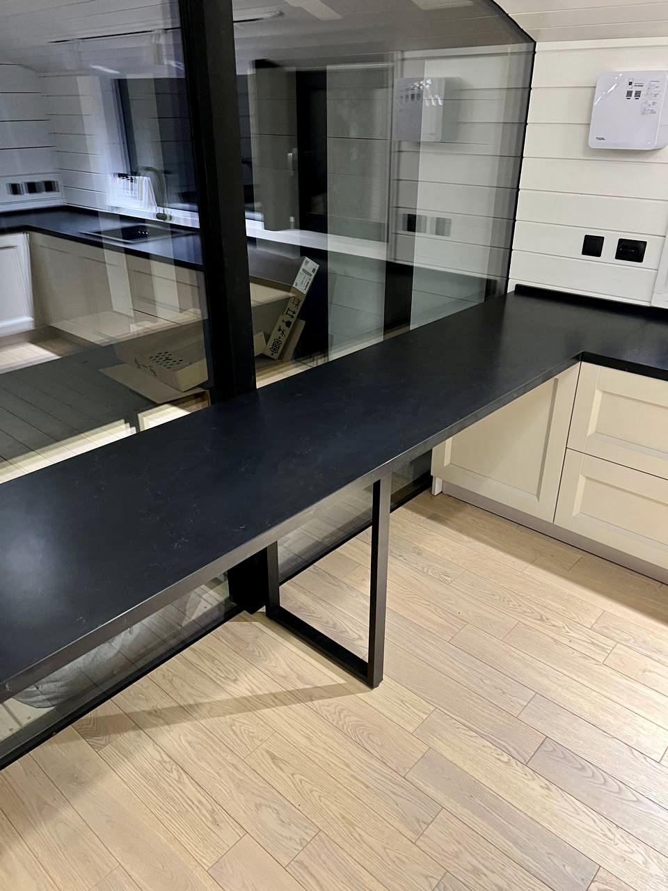 Темная угловая столешница изготовлена из кварцевого агломерата российского бренда Avarus RM510 Черное Море. Поверхность — матовая.