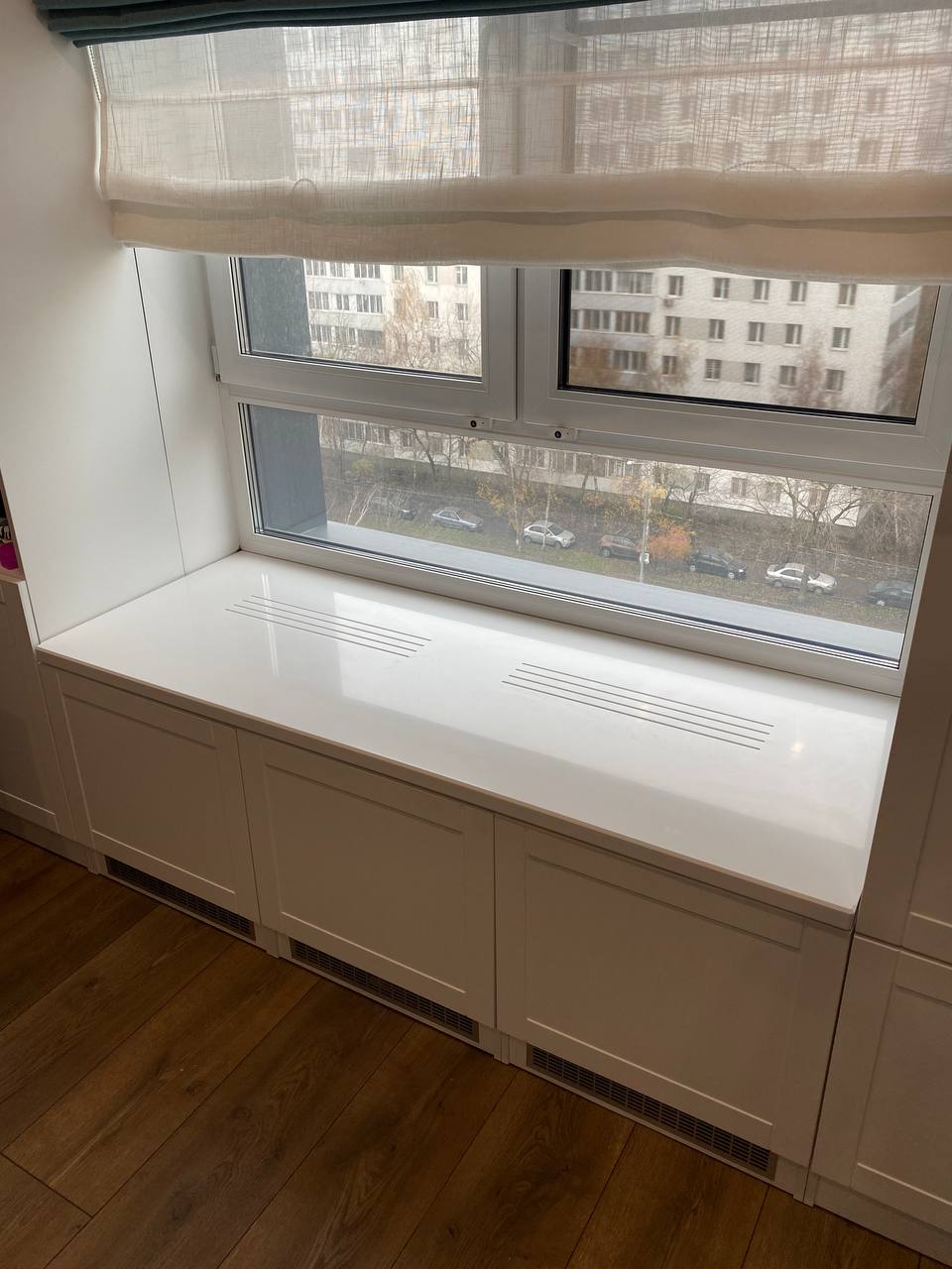 Подоконники сделаны из искусственного акрилового камня, который стоек к воздействию влаги и тепла. Один из подоконников имеет вырезы под радиатор, что позволяет эффективно использовать пространство и обеспечивает оптимальное распределение тепла в помещении. Искусственный акриловый камень не выделяет посторонних запахов, что делает его безопасным и гигиеничным материалом. Однотонный белый камень Grandex P-104 Pure White создает контраст с цветом стен.