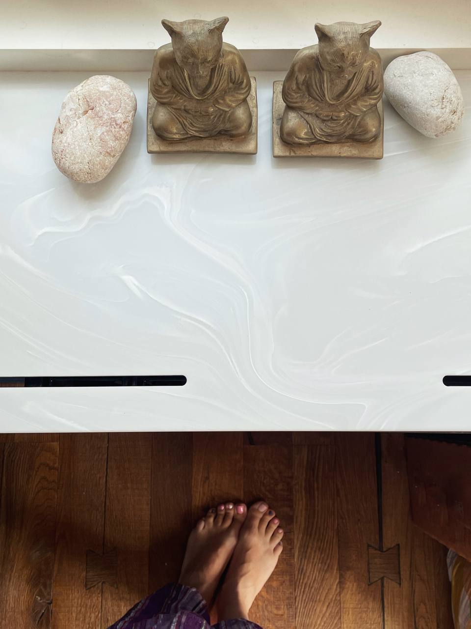 Подоконники под высокими окнами с передней кромкой до пола изготовлены из акрилового камня Grandex M-718 Neptun Trident (B) (3 шт.) и роскошного американского искусственного камня Corian Neutral Aggregate (2 шт.). В некоторых подоконниках выполнены проточные отверстия для радиаторов.