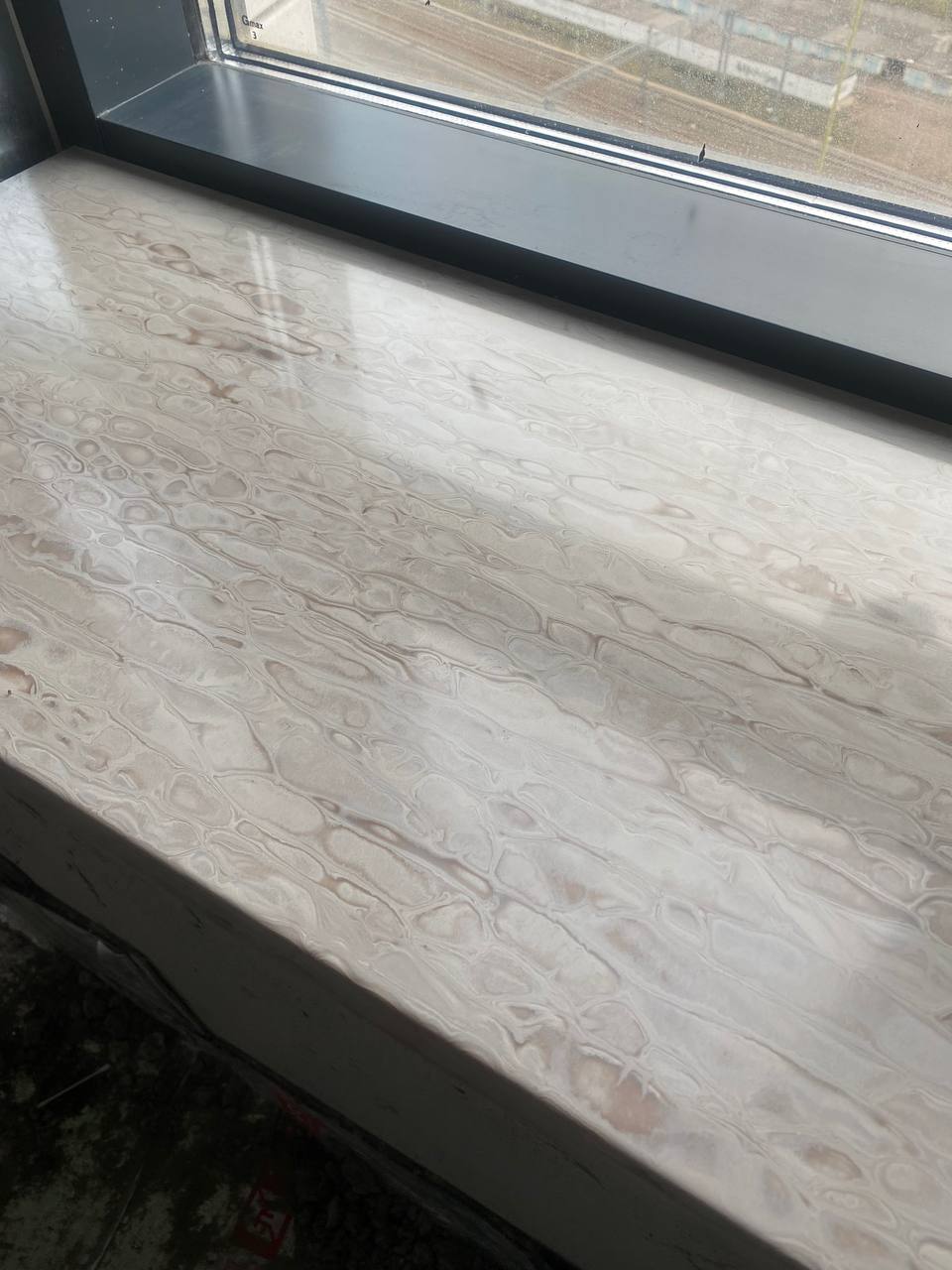 5 подоконников из искусственного акрилового камня. Изделия с уникальной расцветкой - Hanex BL-205 Sedimentary. Цвет напоминает бежевый травертин. Этот камень создаст в вашем интерьере неповторимый стиль. Подоконники имеют прямую форму. Глянцевая поверхность придает им элегантный и блестящий вид. По вашему желанию мы также можем сделать матовую поверхность. В данном случае изделия без ушек, но если вам нравится классическая конфигурация с ушками, наши мастера с радостью изготовят для вас подоконники соответствующего дизайна. Если вы ищете подоконники из искусственного акрилового камня, с уникальной расцветкой и формой - свяжитесь с нами.