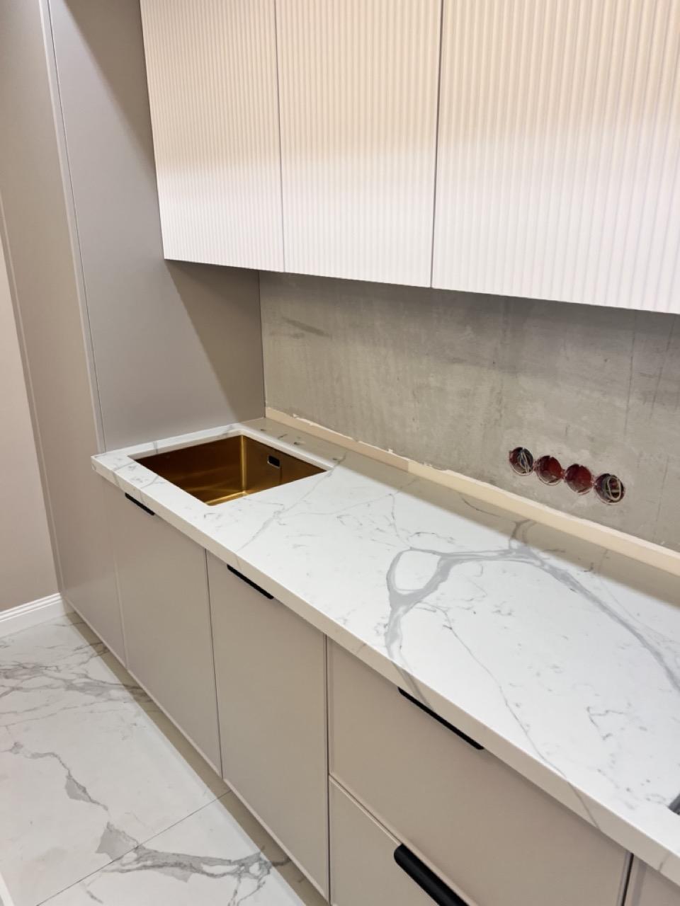 Столешница из белого кварцевого агломерата Авант 7500 Калакатта Аррас с крупными мраморными прожилками изготовлена на кухню заказчика.