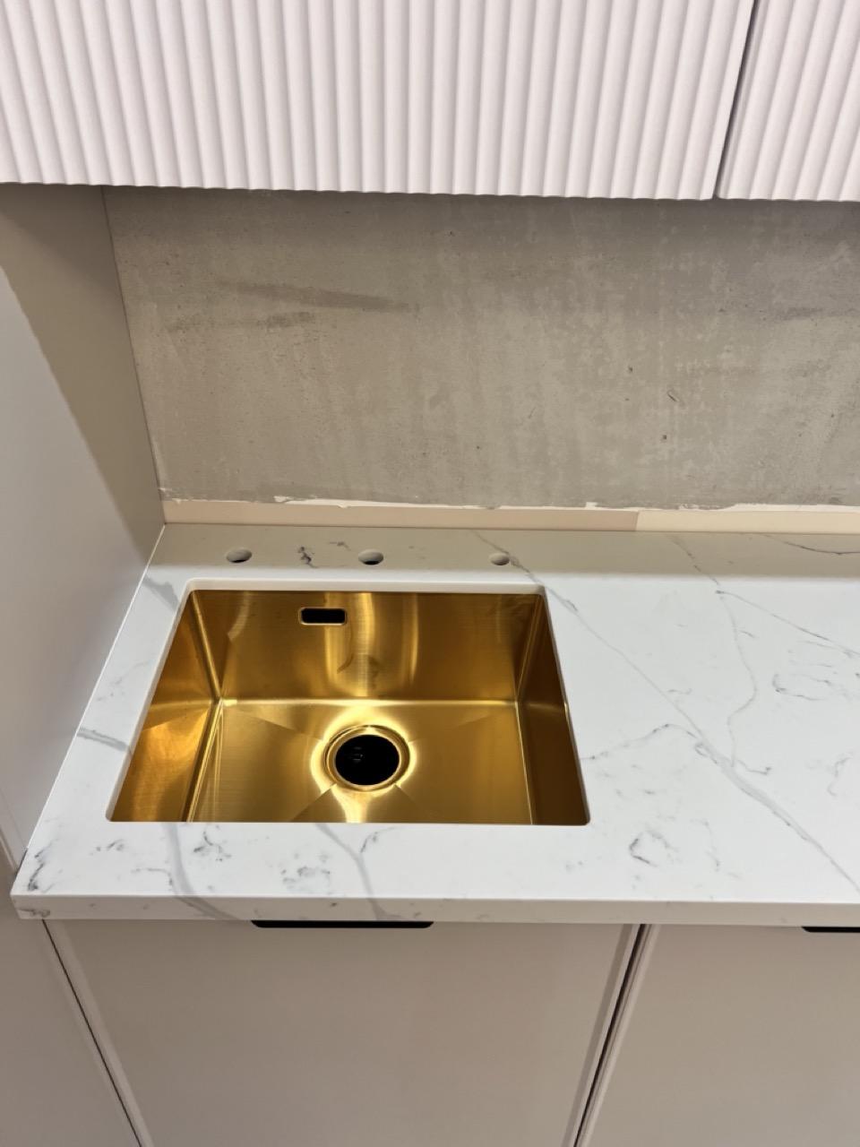 Клиенты хотели столешницу визуально потолще - 40 мм со стандартной кромкой. Наши специалисты исполнили пожелание.