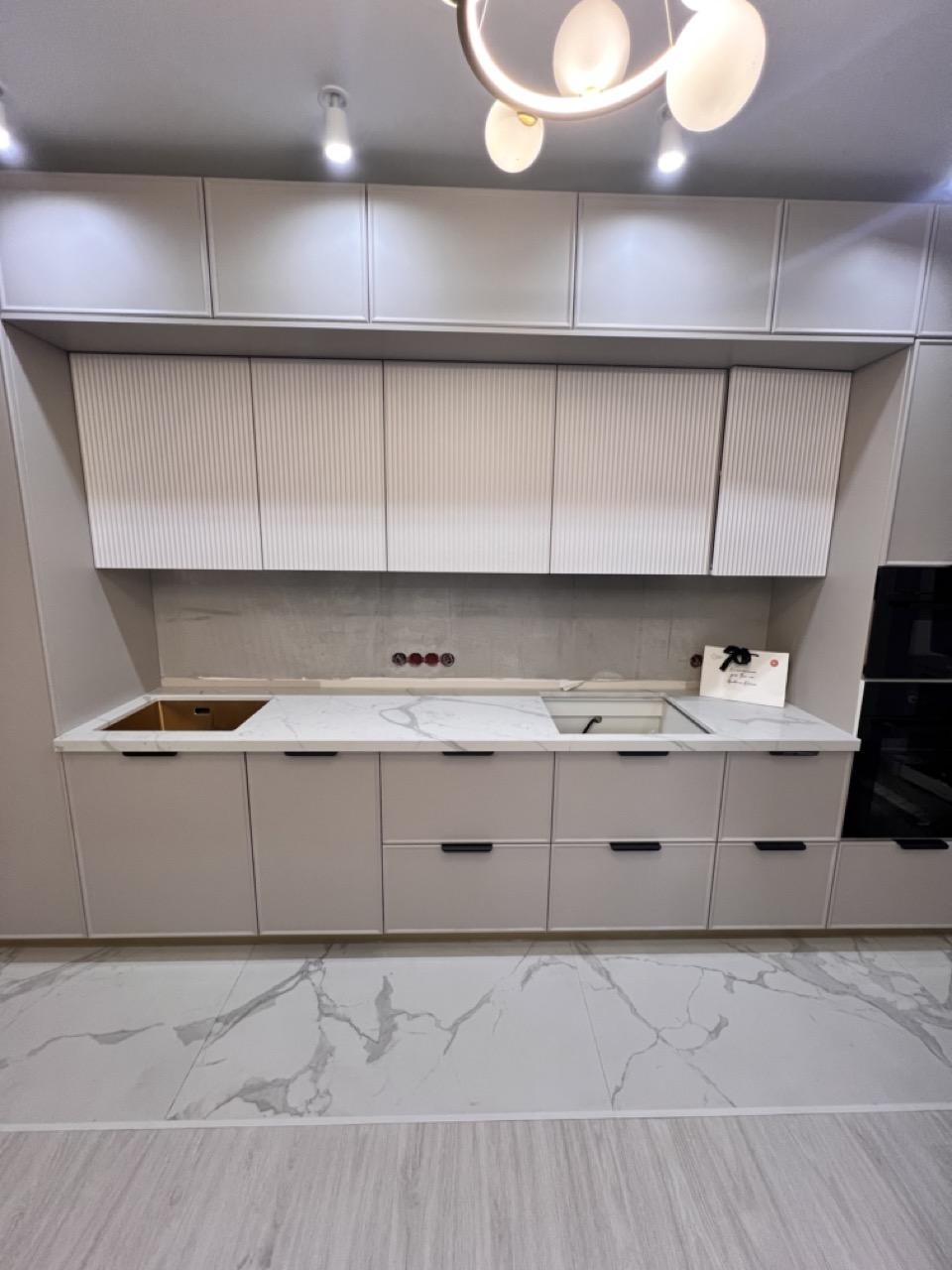 Столешница из белого кварцевого агломерата Авант 7500 Калакатта Аррас с крупными мраморными прожилками изготовлена на кухню заказчика.
