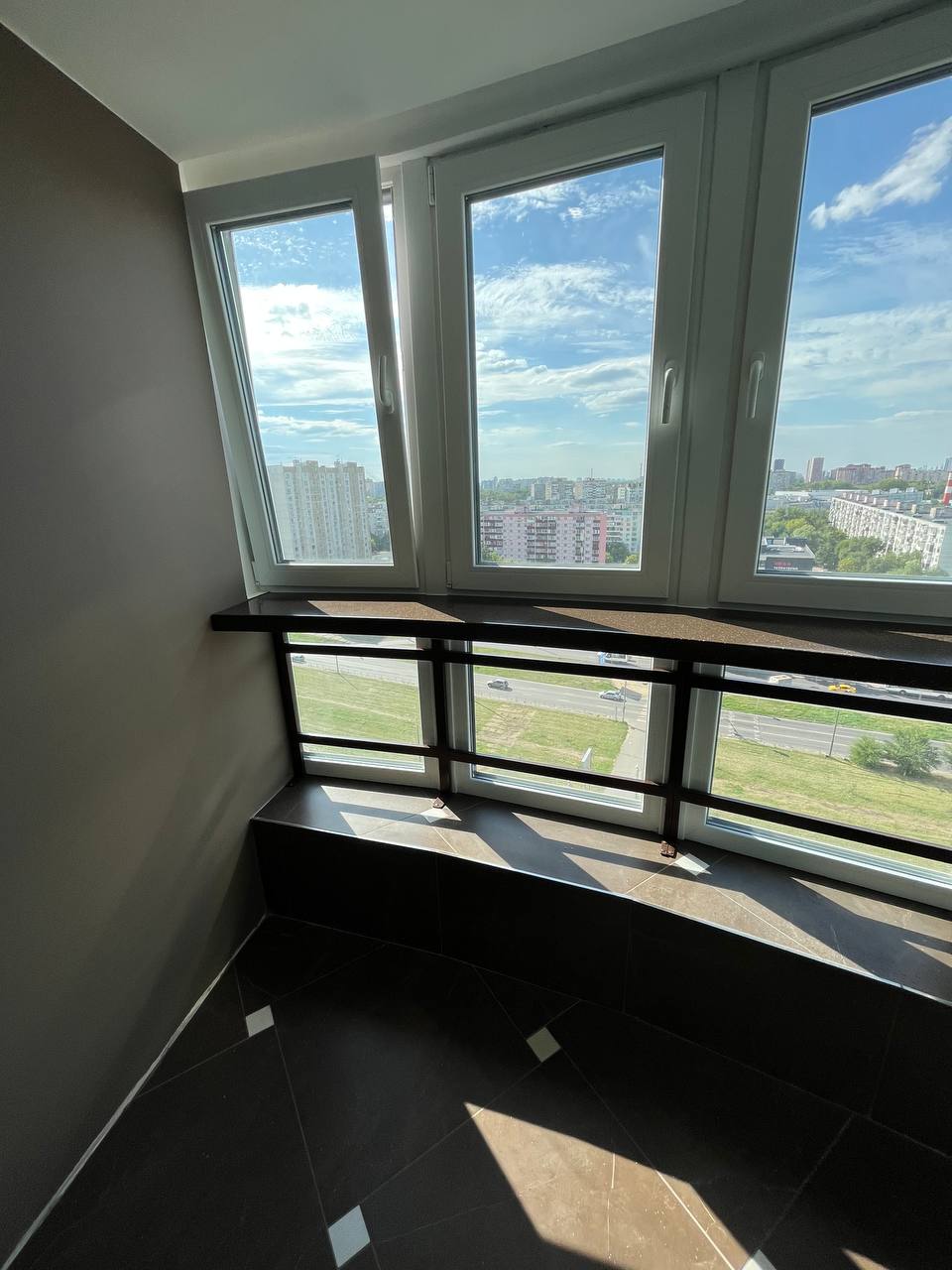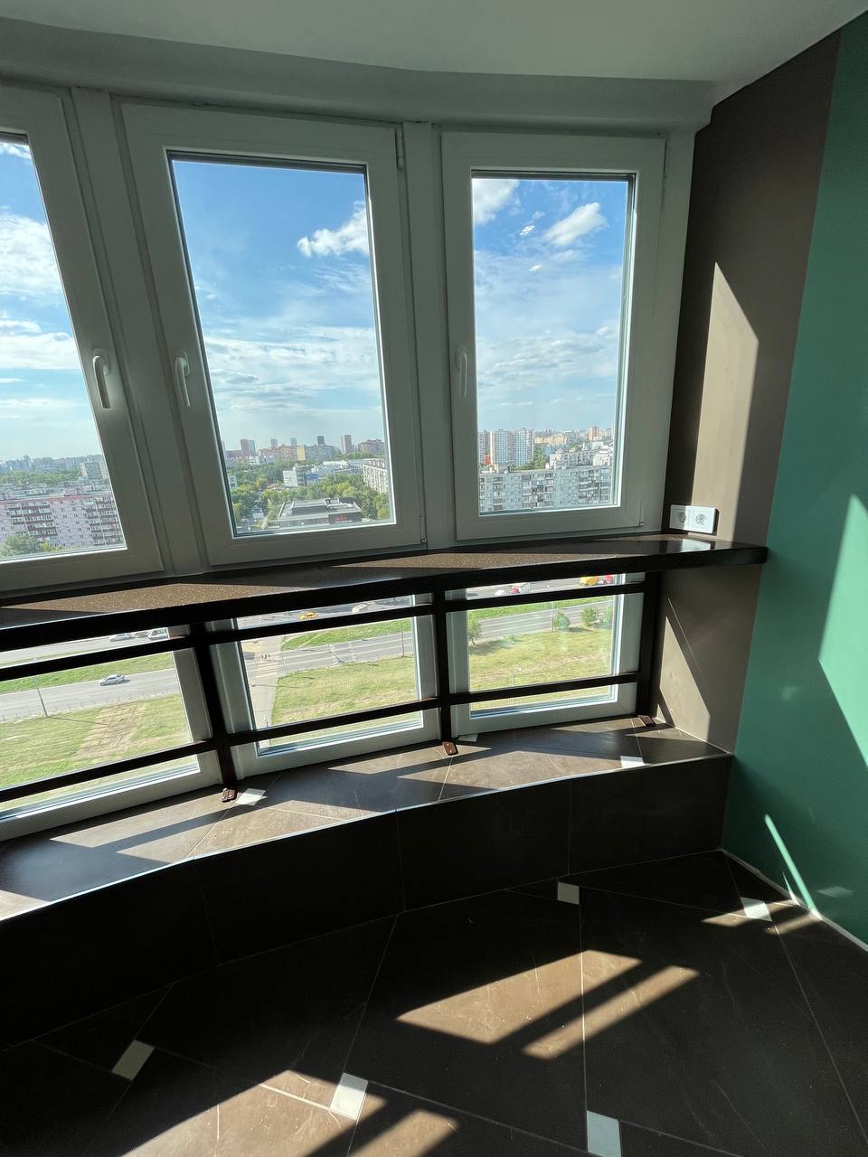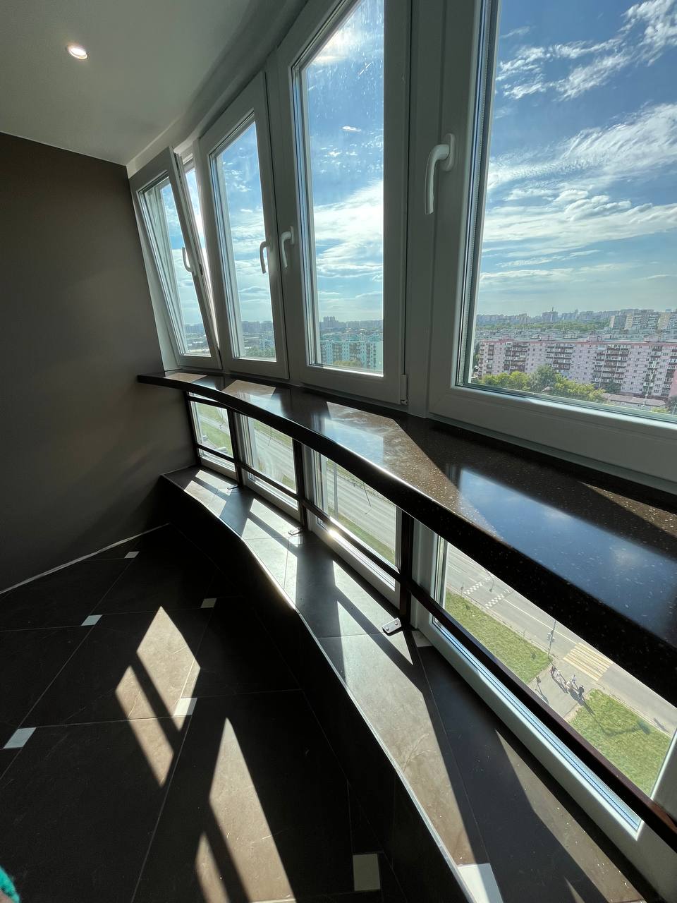 Подоконник от стены до стены радиусной формы. Он сделан из искусственного камня. Цвет Hanex T-222 L-Mocha – коричневый с вкраплениями. Поверхность данного изделия глянцевая. Установлен вдоль большого эркерного окна. Выполнен в виде бесшовной барной стойки, которая опирается на сварную стальную конструкцию в порошковой покраске. Весьма впечатляющее сочетание материалов и форм, создающее эффектный интерьер.