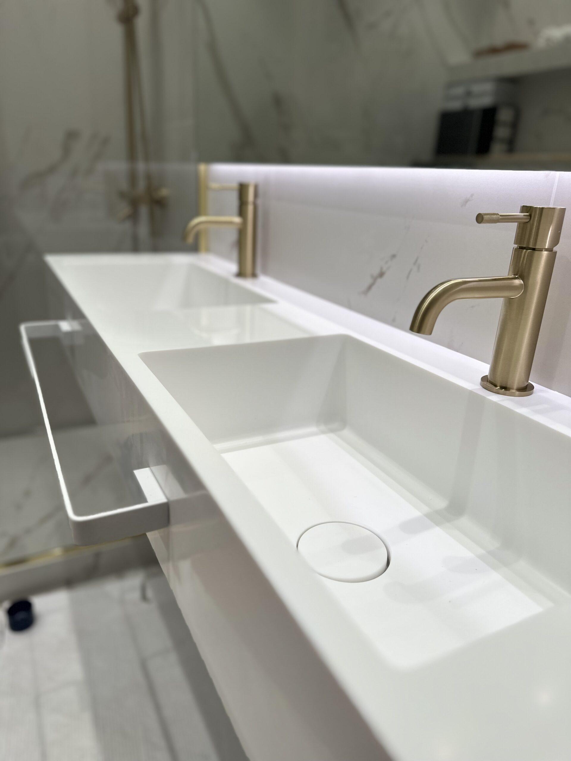Подвесная столешница с двумя интегрированными раковинами изготовлена с использованием искусственного камня Hanex S-008 N-White. Раковины оснащены клапаном клик-клак для удобства использования. Цвет белый однотонный, но мы также можем предложить матовую или глянцевую поверхность в зависимости от предпочтений клиента. Наши изделия сочетают в себе функциональность, прочность и стильный дизайн.