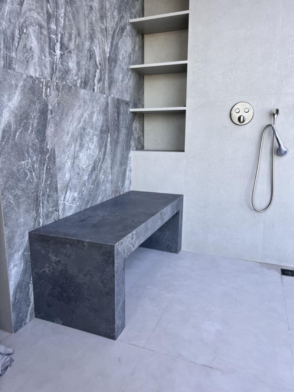Скамья из этого материала в душевой зоне – отличное решение. Нет никаких швов, которые бы нужно было периодически затирать.