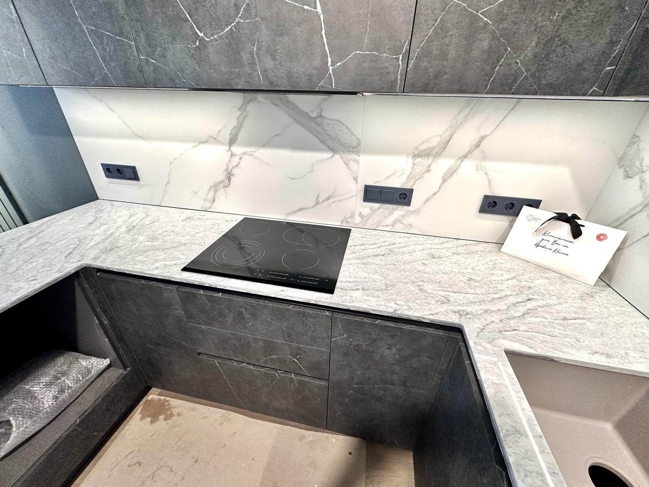 Для всех изделий выбрали единый материал – кварцевый агломерат с крупными прожилками IDS 0805 Grey.