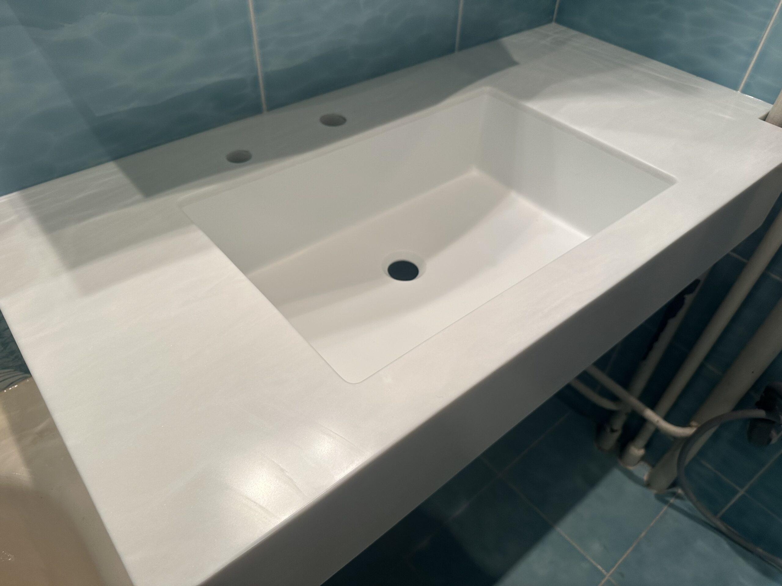 Подвесная столешница и интегрированная раковина изготовлены из акрилового камня.