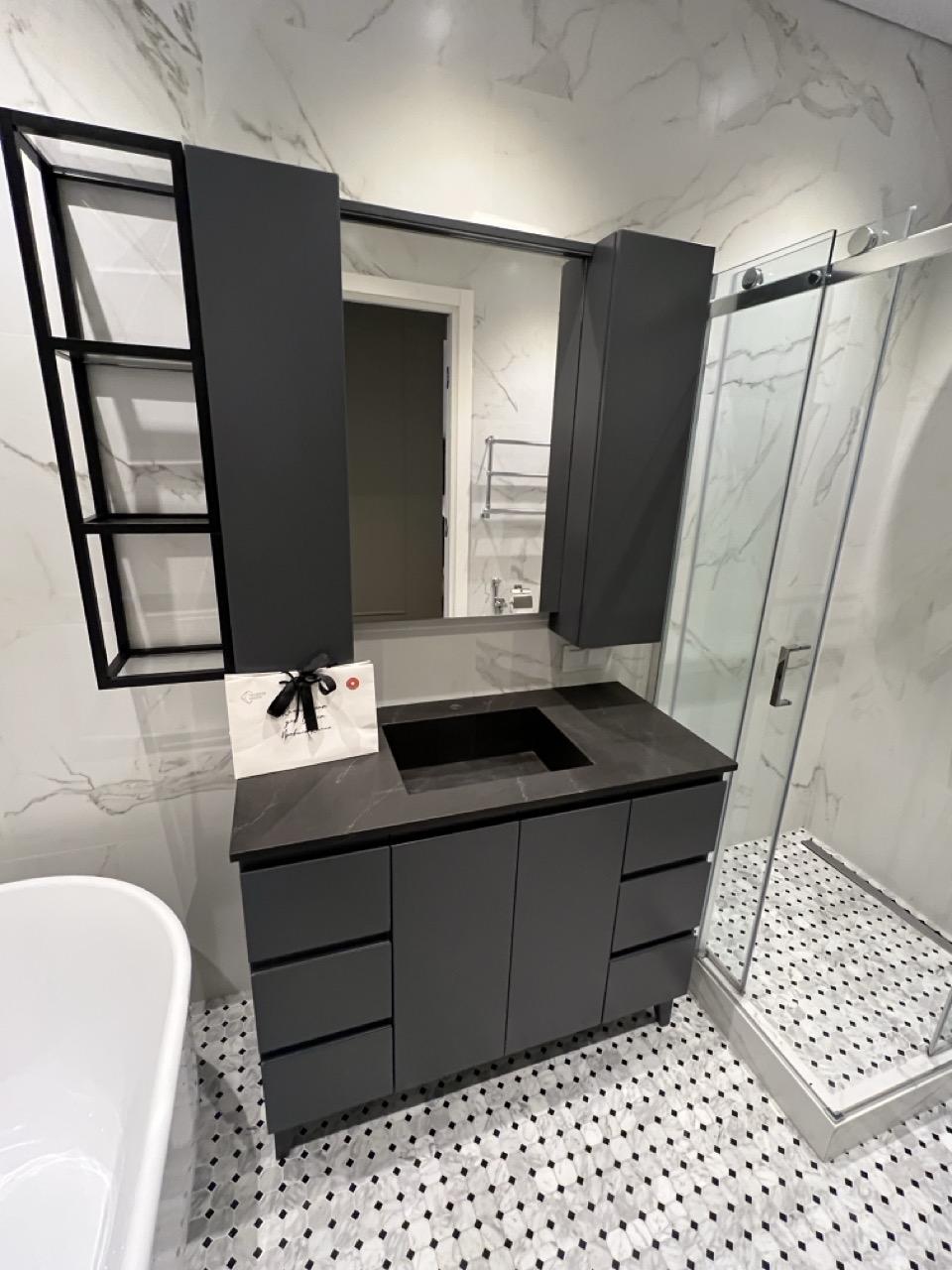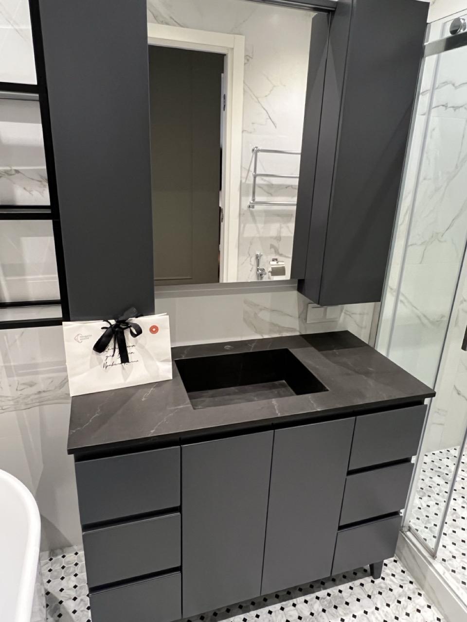 В ванную комнату изготовили кварцевую столешницу и интегрированную раковину прямоугольной формы. Камень выбрали из темных расцветок — Avant 7985 Ницца Ноир. Толщина столешницы — 20 мм. В нашей компании можно заказать и высокие столешницы: 150, 200 мм и более.