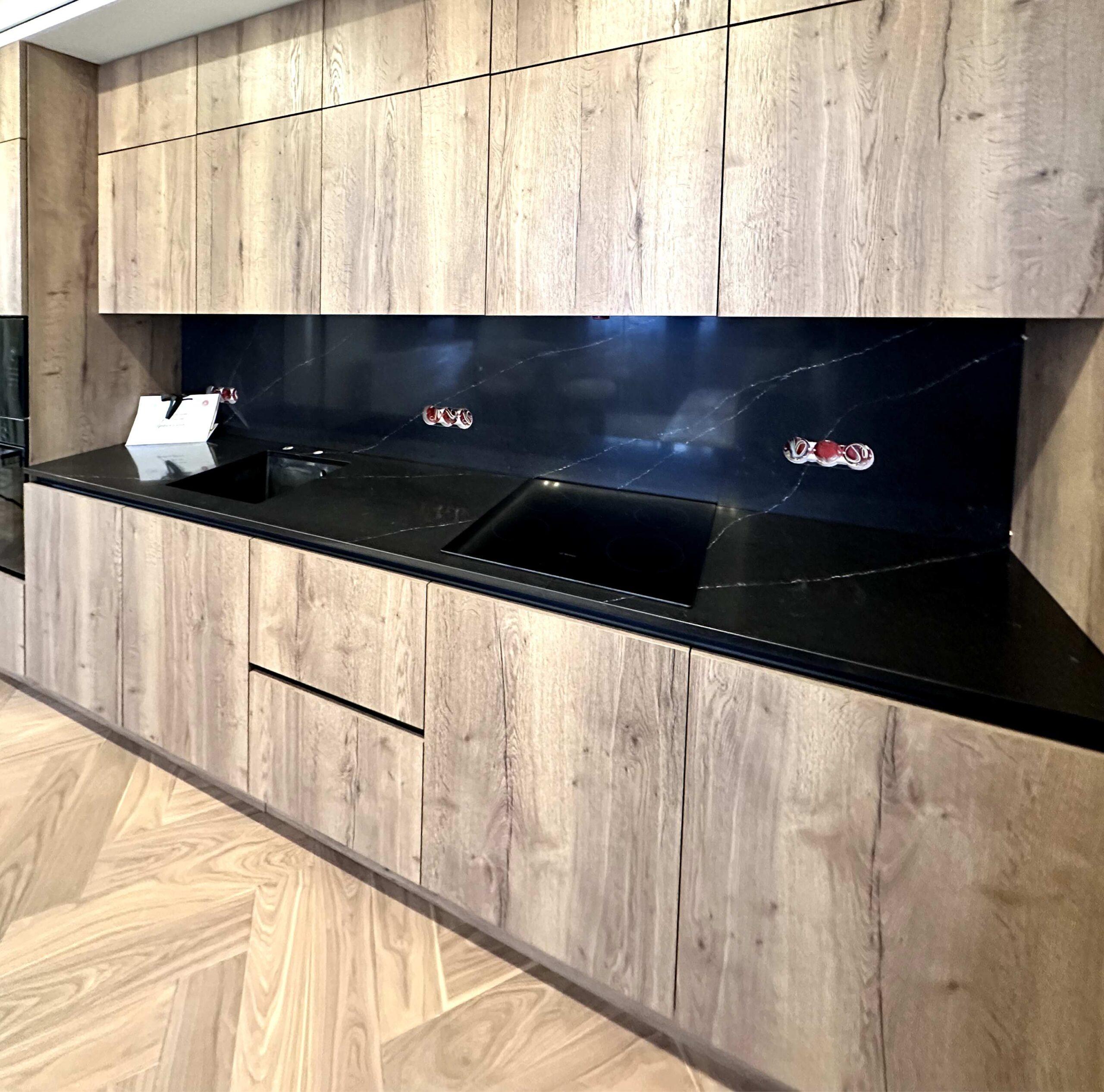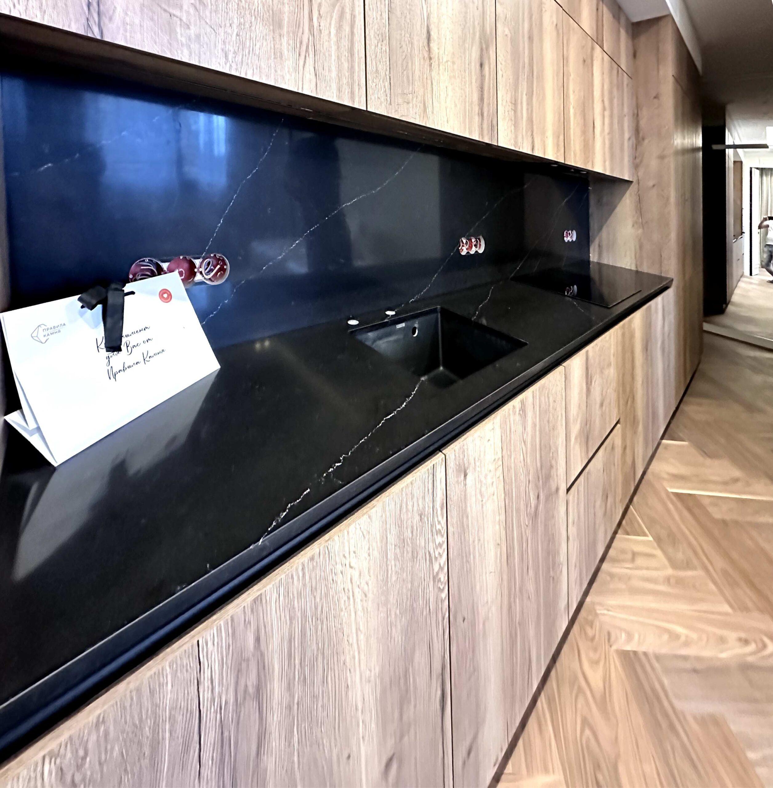 Столешница и фартук изготовлены из кварцевого агломерата Coante 7716 Arte Black. Изделия из черного камня с крупными прожилками отлично вписались в интерьер.
