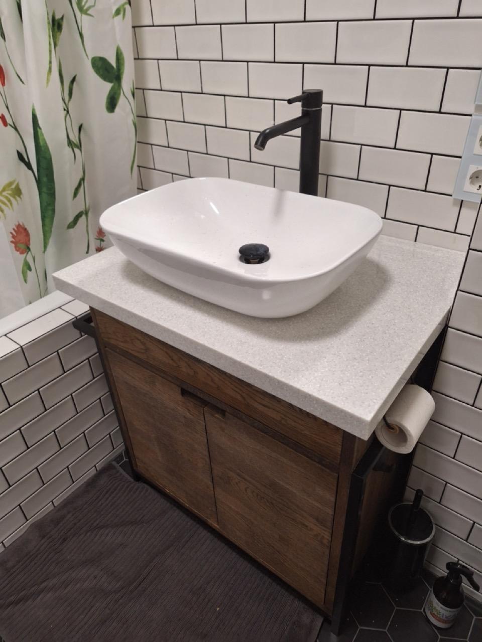 Прямоугольная столешница изготовлена специально под накладную раковину.