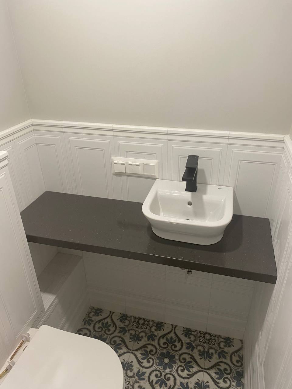 Цвет камня контрастно смотрится с белой настольной раковиной.