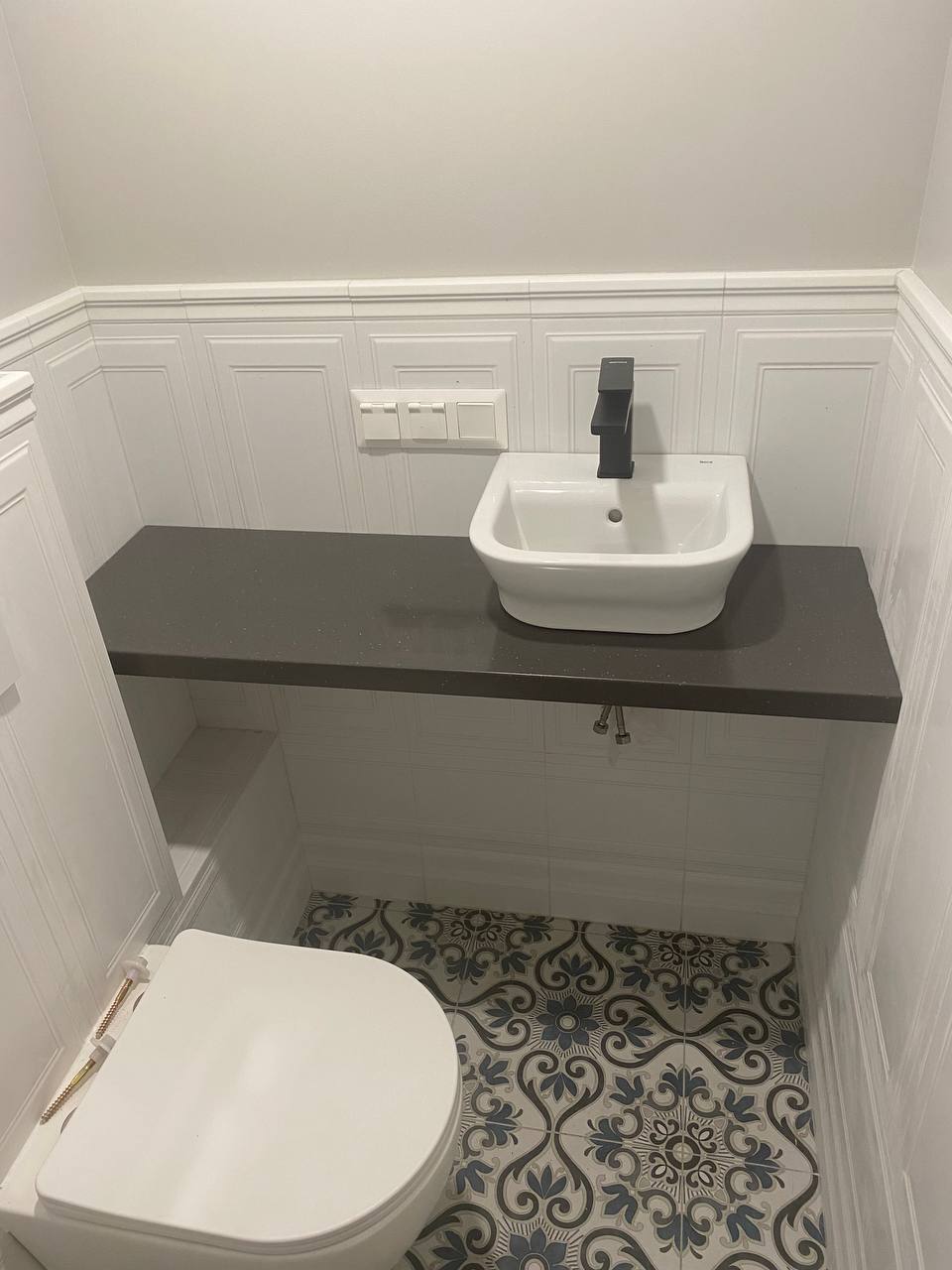 Цвет камня контрастно смотрится с белой настольной раковиной.