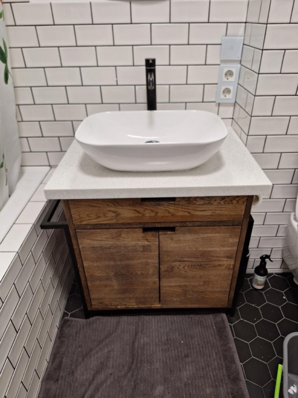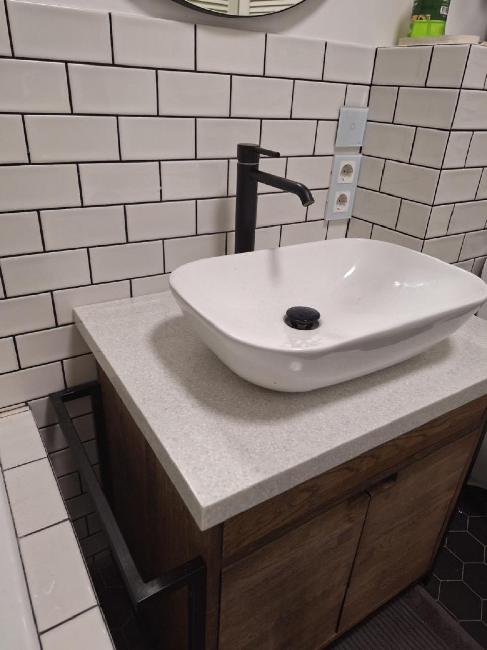 Прямоугольная столешница изготовлена специально под накладную раковину.