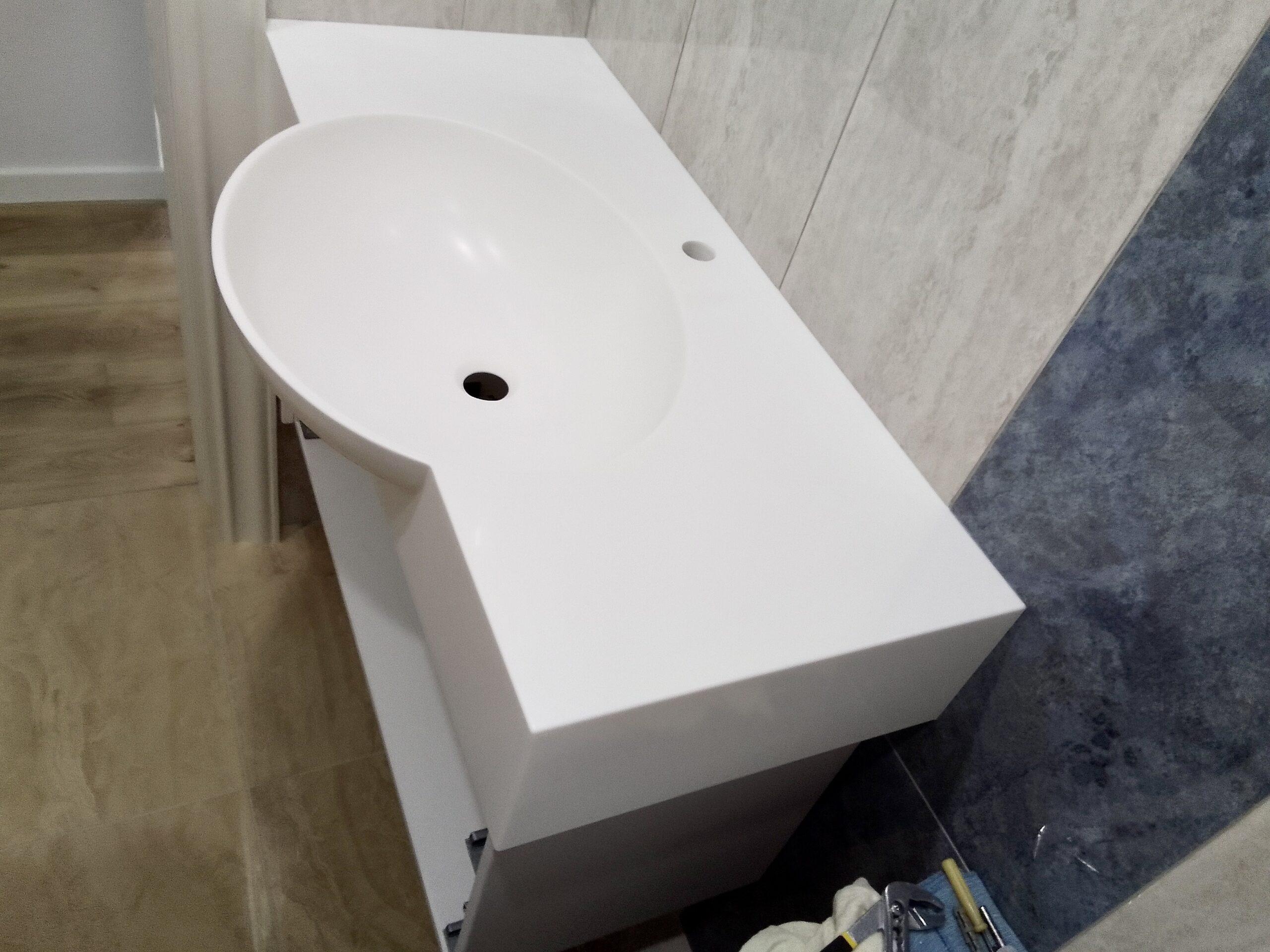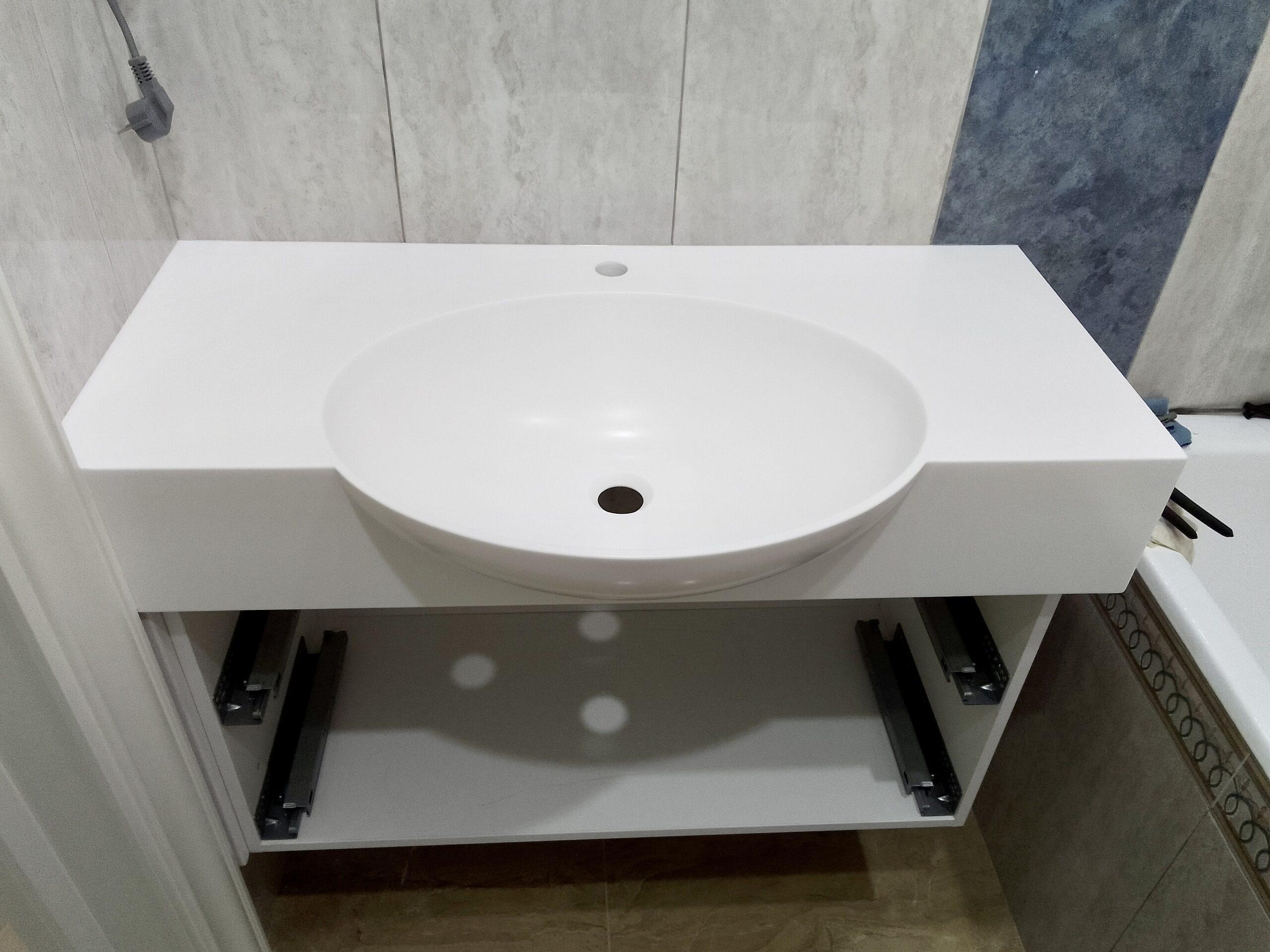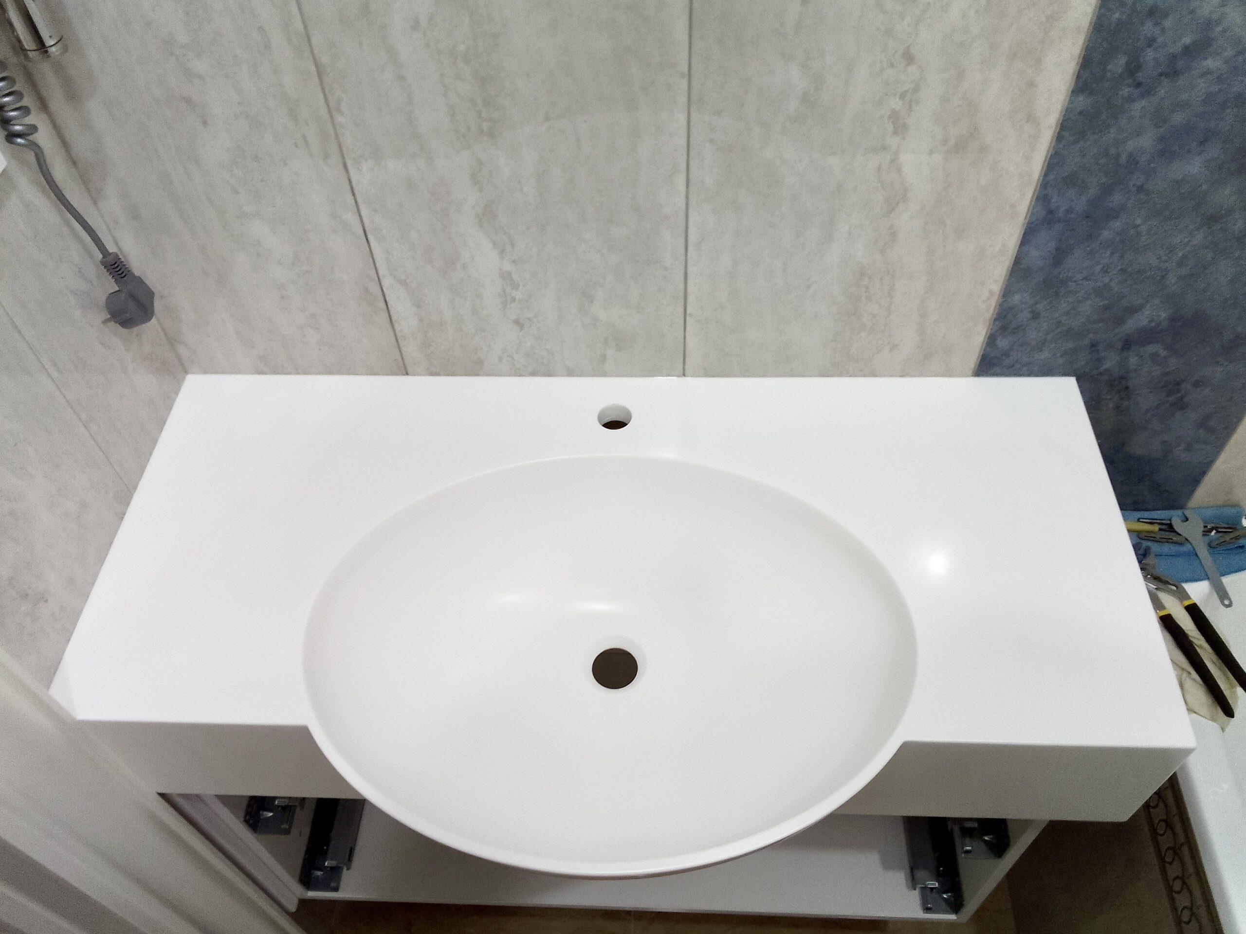 В свою ванную комнату клиент заказал столешницу с интегрированной раковиной овальной формы.